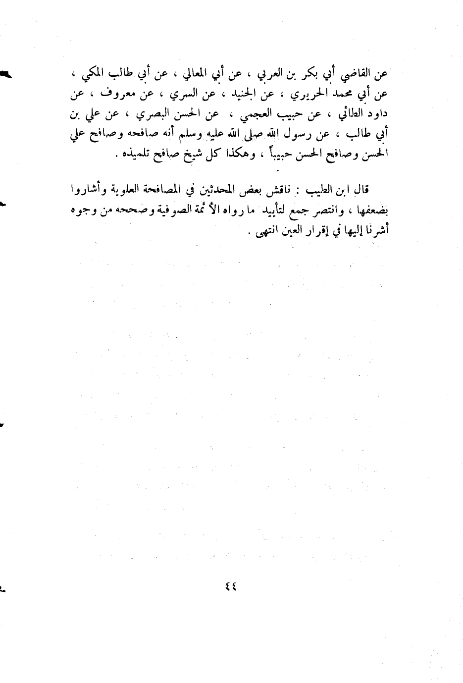 عن القاضي أبي بكر بن العربي، عن أبي المعالي، عن أبي طالب المكي، عن أبي محمد الحريري، عن الجنيد، عن السري، عن معروف، عن داود الطائي، عن حبيب العجمي، عن الحسن البصري، عن علي بن أبي طالب، عن رسول الله صلى الله عليه وسلم أنه صافحه وصافح علي الحسن وصافح الحسن حبيبا، وهكذا كل شيخ صافح تلميذه.