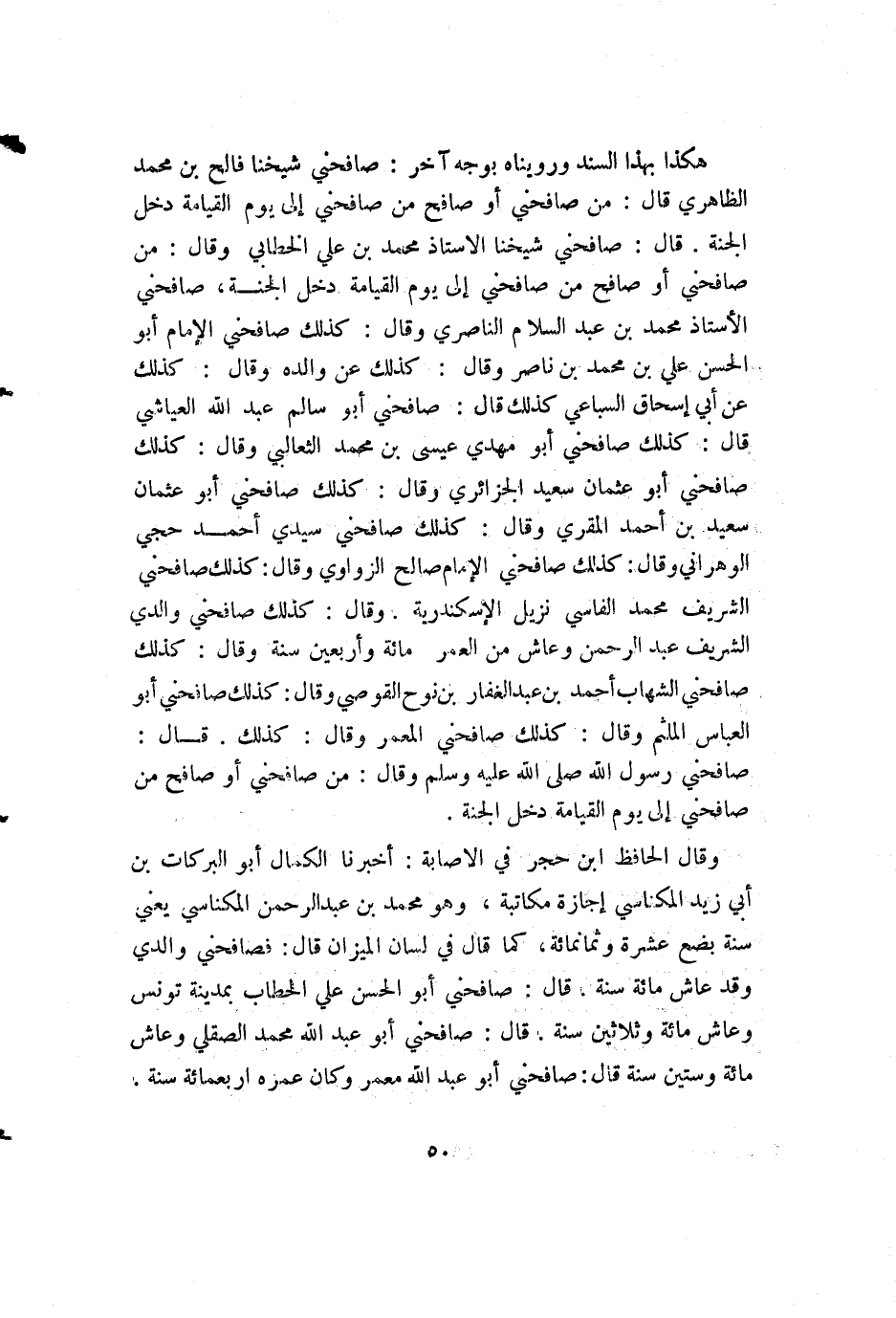 هكذا بهذا السند ورويناه بوجه آخر: صافحني شيخنا فالح بن محمد الظاهري قال: من صافحني أو صافح من صافحني إلى يوم القيامة دخل الجنة، قال: صافحني شيخنا الأستاذ محمد بن علي الخطابي وقال: من صافحني أو صافح من صافحني إلى يوم القيامة دخل الجنة، صافحني الأستاذ محمد بن عبد السلام الناصري وقال: كذلك صافحني الإمام أبو الحسن علي بن محمد بن ناصر وقال: كذلك عن والده وقال: كذلك عن أبي إسحاق السباعي كذلك قال: صافحني أبو سالم عبد الله العياشي قال: كذلك صافحني أبو مهدي عيسى بن محمد الثعالبي وقال: كذلك صافحني أبو عثمان سعيد الجزائري وقال: كذلك صافحني أبو عثمان سعيد بن أحمد المقري وقال: كذلك صافحني سيدي أحمد حجي الوهراني وقال: كذلك صافحني الإمام صالح الزواوي وقال: كذلك صافحني الشريف محمد الفاسي نزيل الإسكندرية. وقال: كذلك صافحني والدي الشريف عبد الرحمن وعاش من العمر مائة وأربعين سنة وقال: كذلك صافحني الشهاب أحمد بن عبد الغفار بن نوح القوصي وقال: كذلك صافحني أبو العباس الملثم وقال: كذلك صافحني المعمر وقال: كذلك. قال: صافحني رسول الله صلى الله عليه وسلم وقال: من صافحني أو صافح من صافحني إلى يوم القيامة دخل الجنة.