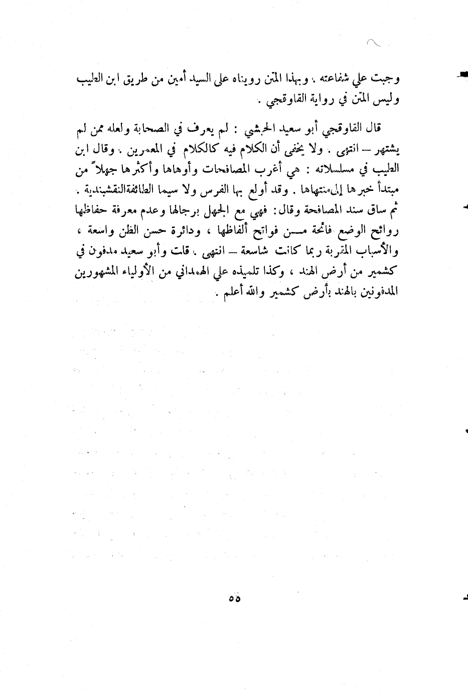 قال القاوقجي أبو سعيد الحبشي: لم يعرف في الصحابة ولعله ممن لم يشتهر - انتهى. ولا يخفى أن الكلام فيه كالكلام في المعمرين. وقال ابن الطيب في مسلسلاته: هي أغرب المصافحات وأوهاها وأكثرها جهلا من مبتدأ خبرها إلى منتهاها. وقد أولع بها الفرس ولا سيما الطائفة النقشبندية. ثم ساق سند المصافحة وقال: فهي مع الجهل برجالها وعدم معرفة حفاظها روائح الوضع فائحة من فواتح ألفاظها، ودائرة حسن الظن واسعة، والأسباب المقربة ربما كانت شاسعة - انتهى. قلت وأبو سعيد مدفون في كشمير من أرض الهند، وكذا تلميذه علي الهمداني من الأولياء المشهورين المدفونين بالهند بأرض كشمير والله أعلم.