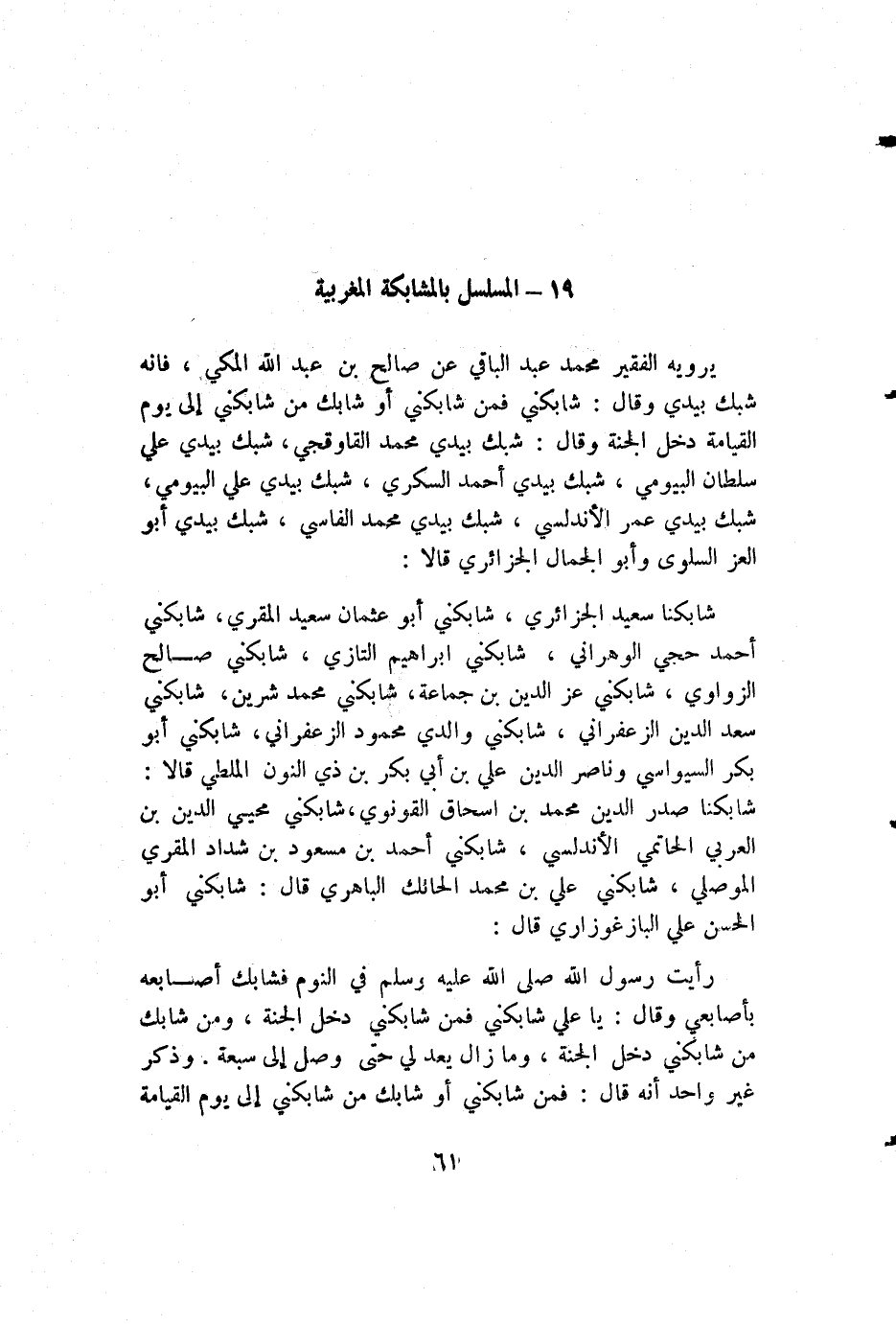 يرويه الفقير محمد عبد الباقي عن صالح بن عبد الله المكي، فإنه شبك بيدي وقال: شابكني فمن شابكني أو شابك من شابكني إلى يوم القيامة دخل الجنة وقال: شبك بيدي محمد القاوقجي، شبك بيدي علي سلطان البيومي، شبك بيدي أحمد السكري، شبك بيدي علي البيومي، شبك بيدي عمر الأندلسي، شبك بيدي محمد الفاسي، شبك بيدي أبو العز السلوى وأبو الجمال الجزائري قالا:
