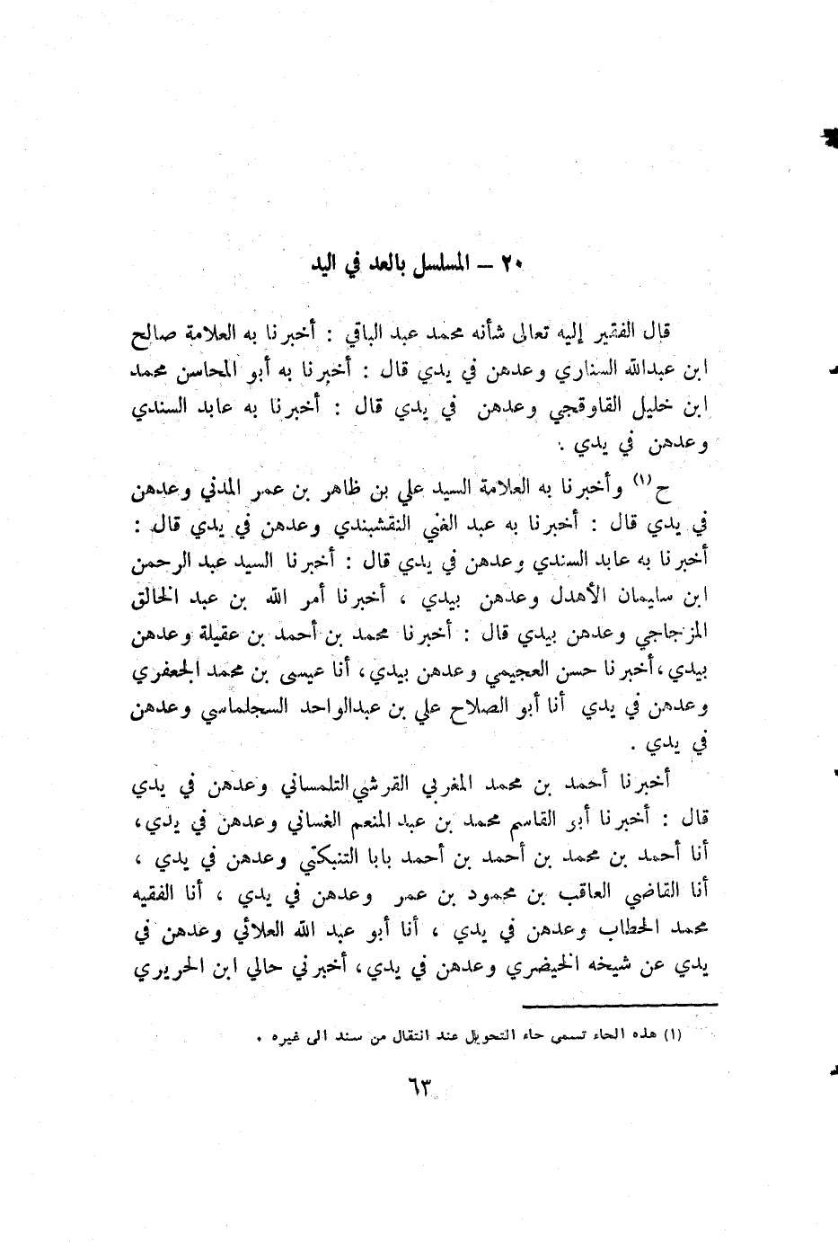 قال الفقير إليه تعالى شأنه محمد عبد الباقي: أخبرنا به العلامة صالح بن عبد الله السناري وعدهن في يدي قال: أخبرنا به أبو المحاسن محمد بن خليل القاوقجي وعدهن في يدي قال: أخبرنا به عابد السندي وعدهن في يدي.