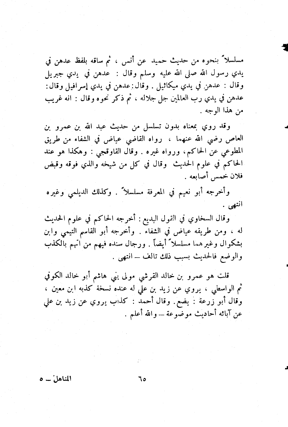 وقد روي بمعناه بدون تسلسل من حديث عبد الله بن عمرو بن العاص رضي الله عنهما، رواه القاضي عياض في الشفاء من طريق المطوعي عن الحاكم، ورواه غيره. وقال القاوقجي: وهكذا هو عند الحاكم في علوم الحديث وقال في كل من شيخه والذي فوقه وقبض فلان خمس أصابعه.