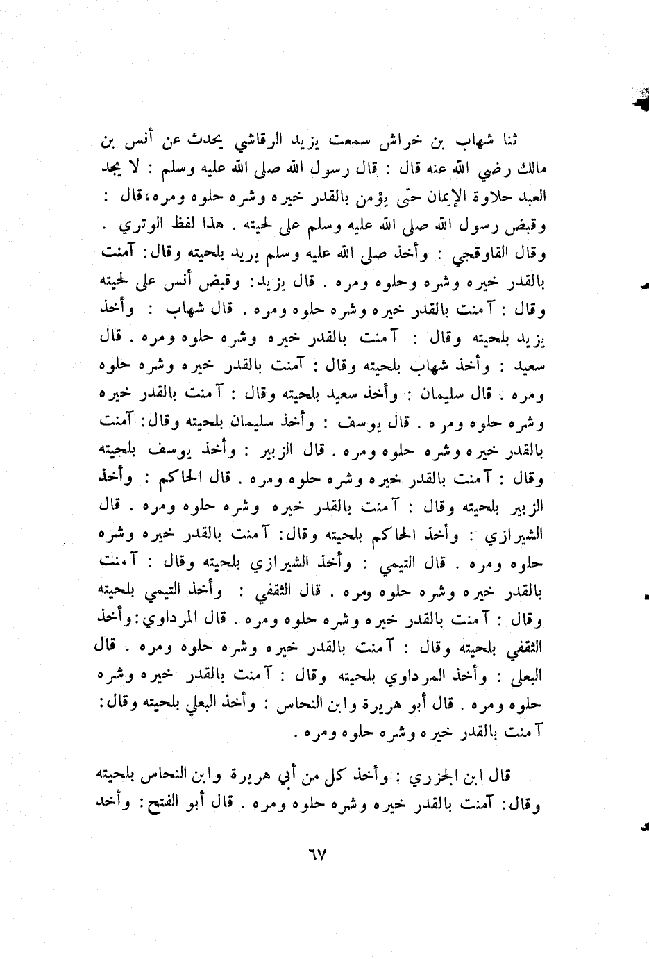 ثنا شهاب بن خراش سمعت يزيد الرقاشي يحدث عن أنس بن مالك رضي الله عنه قال: قال رسول الله صلى الله عليه وسلم: لا يجد العبد حلاوة الإيمان حتى يؤمن بالقدر خيره وشره حلوه ومره، قال: وقبض رسول الله صلى الله عليه وسلم على لحيته. هذا لفظ الوتري. وقال القاوقجي: وأخذ صلى الله عليه وسلم يريد بلحيته وقال: آمنت بالقدر خيره وشره وحلوه ومره. قال يزيد: وقبض أنس على لحيته وقال: آمنت بالقدر خيره وشره حلوه ومره. قال شهاب: وأخذ يزيد بلحيته وقال: آمنت بالقدر خيره وشره حلوه ومره. قال سعيد: وأخذ شهاب بلحيته وقال: آمنت بالقدر خيره وشره حلوه ومره. قال سليمان: وأخذ سعيد بلحيته وقال: آمنت بالقدر خيره وشره حلوه ومره. قال يوسف: وأخذ سليمان بلحيته وقال: آمنت بالقدر خيره وشره حلوه ورمه. قال الزبير: وأخذ يوسف بلحيته وقال: آمنت بالقدر خيره وشره حلوه ومره. قال الحاكم: وأخذ الزبير بلحيته وقال: آمنت بالقدر خيره وشره حلوه ومره. قال الشيرازي: وأخذ الحاكم بلحيته وقال: آمنت بالقدر خيره وشره حلوه ومره. قال التيمي: وأخذ الشيرازي بلحيته وقال: آمنت بالقدر خيره وشره حلوه ومره. قال الثقفي: وأخذ التيمي بلحيته وقال: آمنت بالقدر خيره وشره حلوه ومره. قال المرداوي: وأخذ الثقفي بلحيته وقال: آمنت بالقدر خيره وشره حلوه ومره. قال البعلي: وأخذ المرداوي بلحيته وقال: آمنت بالقدر خيره وشره حلوه ومره. قال أبو هريرة وابن النحاس: وأخذ البعلي بلحيته وقال: آمنت بالقدر خيره وشره حلوه ومره.