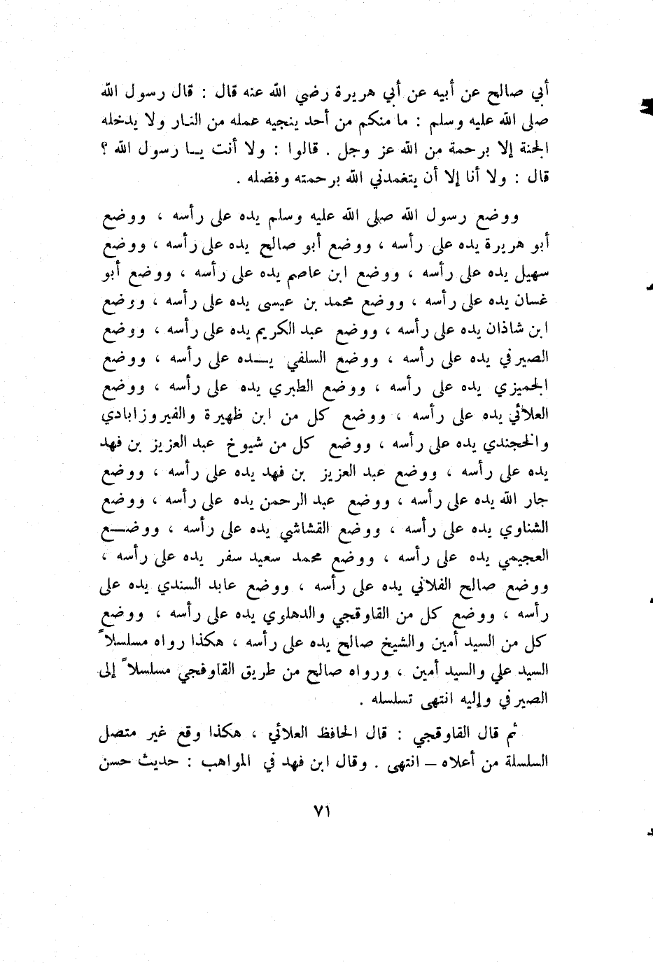 ووضع رسول الله صلى الله عليه وسلم يده على رأسه، ووضع أبو هريرة يده على رأسه، ووضع أبو صالح يده على رأسه، ووضع سهيل يده على رأسه، ووضع ابن عاصم يده على رأسه، ووضع أبو غسان يده على رأسه، ووضع محمد بن عيسى يده على رأسه، ووضع ابن شاذان يده على رأسه، ووضع عبد الكريم يده على رأسه، ووضع الصيرفي يده على رأسه، ووضع السلفي يده على رأسه، ووضع الجميزي يده على رأسه، ووضع الطبري يده على رأسه، ووضع العلائي يده على رأسه، ووضع كل من ابن ظهيرة والفيروزابادي والخجندي يده على رأسه، ووضع كل من شيوخ عبد العزيز بن فهد يده على رأسه، ووضع عبد العزيز بن فهد يده على رأسه، ووضع جار الله يده على رأسه، ووضع عبد الرحمن يده على رأسه، ووضع الشناوي يده على رأسه، ووضع القشاشي يده على رأسه، ووضع العجيمي يده على رأسه، ووضع محمد سعيد سفر يده على رأسه، ووضع صالح الفلاني يده على رأسه، ووضع عابد السندي يده على رأسه، ووضع كل من القاوقجي والدهلوي يده على رأسه، ووضع كل من السيد أمين والشيخ صالح يده على رأسه، هكذا رواه مسلسلا السيد علي والسيد أمين، رواه صالح من طريق القاوقجي مسلسلا إلى الصيرفي وإليه انتهى تسلسله.