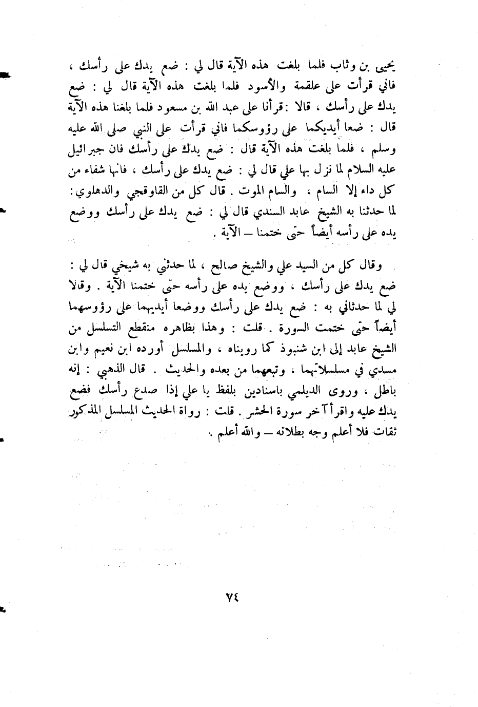 وقال كل من السيد علي والشيخ صالح، لما حدثني به شيخي قال لي: ضع يدك على رأسك، ووضع يده على رأسه حتى ختمنا الآية. وقالا لي لما حدثاني به: ضع يدك على رأسك ووضعا أيديهما على رؤوسهما أيضا حتى ختمت السورة. قلت: وهذا بظاهره منقطع التسلسل من الشيخ عابد إلى ابن شنبوذ كما رويناه، والمسلسل أورده ابن نعيم وابن مسدي في مسلسلاتهما، وتبعهما من بعده والحديث. قال الذهبي: إنه باطل، وروى الديلمي بإسنادين بلفظ يا علي إذا صدع رأسك فضع يدك عليه واقرأ آخر سورة الحشر. قلت: رواة الحديث المسلسل المذكور ثقات فلا أعلم وجه بطلانه - والله أعلم.