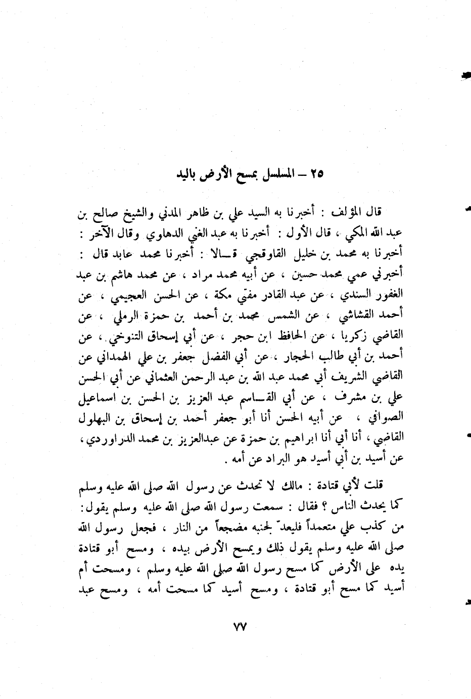 قال المؤلف: أخبرنا به السيد علي بن ظاهر المدني والشيخ صالح بن عبد الله المكي، قال الأول: أخبرنا به عبد الغني الدهاوي وقال الآخر: أخبرنا به محمد بن خليل القاوقجي قالا: أخبرنا محمد عابد قال: أخبرني عمي محمد حسين، عن أبيه محمد مراد، عن محمد هاشم بن عبد الغفور السندي، عن عبد القادر مفتي مكة، عن الحسن العجيمي، عن أحمد القشاشي، عن الشمس محمد بن أحمد بن حمزة الرملي، عن القاضي زكريا، عن الحافظ ابن حجر، عن أبي إسحاق التنوخي، عن أحمد بن أبي طالب الحجار، عن أبي الفضل جعفر بن علي الهمداني عن القاضي الشريف أبي محمد عبد الله بن عبد الرحمن العثماني عن أبي الحسن علي بن مشرف، عن أبي القاسم عبد العزيز بن الحسن بن إسماعيل الصوافي، عن أبيه الحسن أنا أبو جعفر أحمد بن إسحاق بن البهلول القاضي، أنا أبي أنا إبراهيم بن حمزة عن عبد العزيز بن محمد الدراوردي، عن أسيد بن أبي أسيد هو البراد عن أمه.
