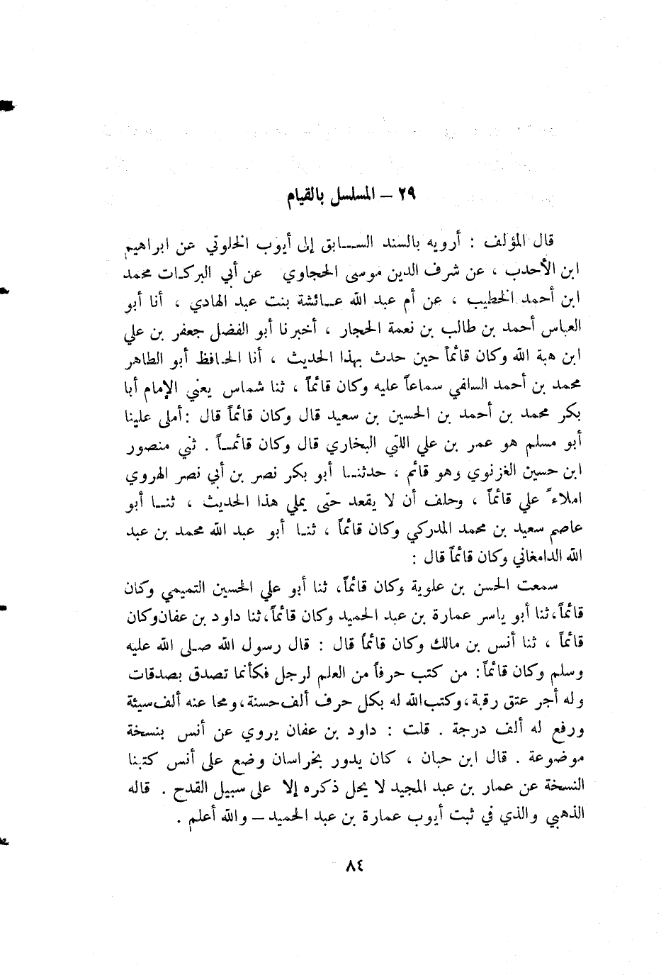 سمعت الحسن بن علوية وكان قائما، ثنا أبو علي الحسين التميمي وكان قائما، ثنا أبو ياسر عمارة بن عبد الحميد وكان قائما، ثنا داود بن عفان وكان قائما، ثنا أنس بن مالك وكان قائما قال: قال رسول الله صلى الله عليه وسلم وكان قائما: من كتب حرفا من العلم لرجل فكأنما تصدق بصدقات وله أجر عتق رقبة، وكتب الله له بكل حرف ألف حسنة، ومحا عنه ألف سيئة ورفع له ألف درجة. قلت: داود بن عفان يروي عن أنس بنسخة موضوعة. قال ابن حبان، كان يدور بخراسان وضع على أنس كتبنا النسخة عن عمار بن عبد المجيد لا يحل ذكره إلا على سبيل القدح. قاله الذهبي والذي في ثبت أيوب عمارة بن عبد الحميد - والله أعلم.