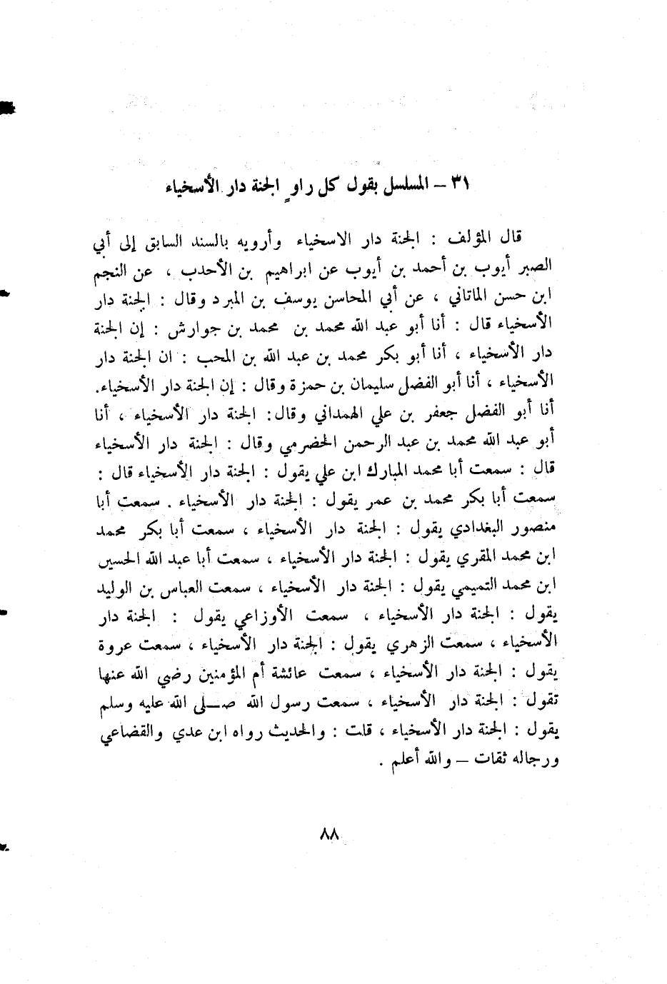 قال المؤلف: الجنة دار الأسخياء وأرويه بالسند السابق إلى أبي الصبر أيوب بن أحمد بن أيوب عن إبراهيم بن الأحدب، عن النجم بن حسن الماتاني، عن أبي المحاسن يوسف بن المبرد وقال: الجنة دار الأسخياء قال: أنا أبو عبد الله محمد بن محمد بن جوارش: إن الجنة دار الأسخياء، أنا أبو بكر محمد بن عبد الله بن المحب: إن الجنة دار الأسخياء، أنا أبو الفضل سليمان بن حمزة وقال: إن الجنة دار الأسخياء. أنا أبو الفضل جعفر بن علي الهمداني وقال: الجنة دار الأسخياء، أنا أبو عبد الله محمد بن عبد الرحمن الحضرمي وقال: الجنة دار الأسخياء قال: سمعت أبا محمد المبارك بن علي يقول: الجنة دار الأسخياء قال: سمعت أبا بكر محمد بن عمر يقول: الجنة دار الأسخياء. سمعت أبا منصور البغدادي يقول: الجنة دار الأسخياء، سمعت أبا بكر محمد بن محمد المقري يقول: الجنة دار الأسخياء، سمعت أبا عبد الله الحسين بن محمد التميمي يقول: الجنة دار الأسخياء، سمعت العباس بن الوليد يقول: الجنة دار الأسخياء، سمعت الأوزاعي يقول: الجنة دار الأسخياء، سمعت الزهري يقول: الجنة دار الأسخياء، سمعت عروة يقول: الجنة دار الأسخياء، سمعت عائشة أم المؤمنين رضي الله عنها تقول: الجنة دار الأسخياء، سمعت رسول الله صلى الله عليه وسلم يقول: الجنة دار الأسخياء، قلت: والحديث رواه ابن عدي والقضاعي ورجاله ثقات - والله أعلم.