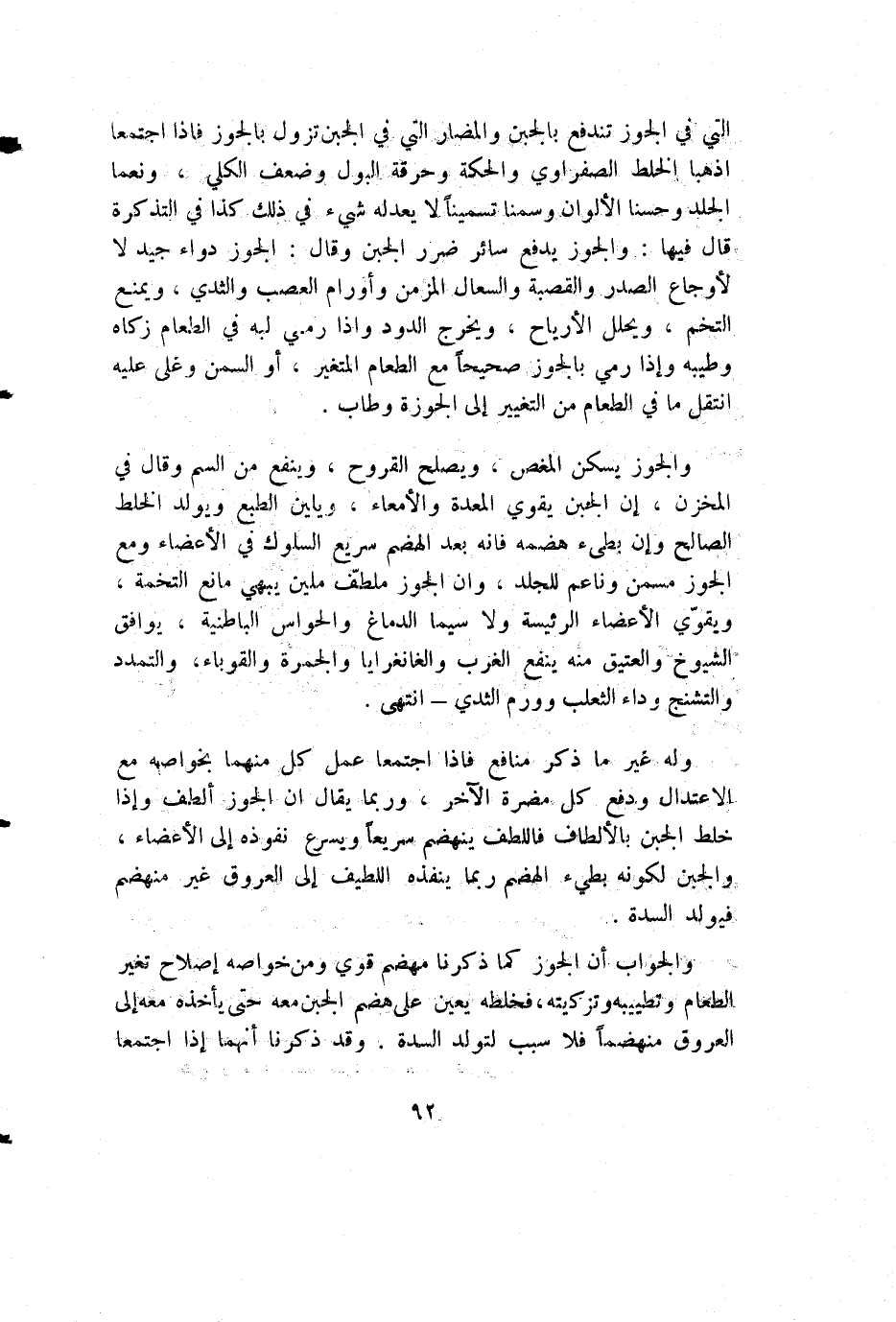وله غير ما ذكر منافع فإذا اجتمعا عمل كل منهما بخواصه مع الاعتدال ودفع كل مضرة الآخر، وربما يقال أن الجوز ألطف وإذا خلط الجبن بالألطاف فاللطف ينهضم سريعا ويسرع نفوذه إلى الأعضاء، والجبن لكونه بطيء الهضم ربما ينفذه اللطيف إلى العروق غير منهضم فيولد السدة.