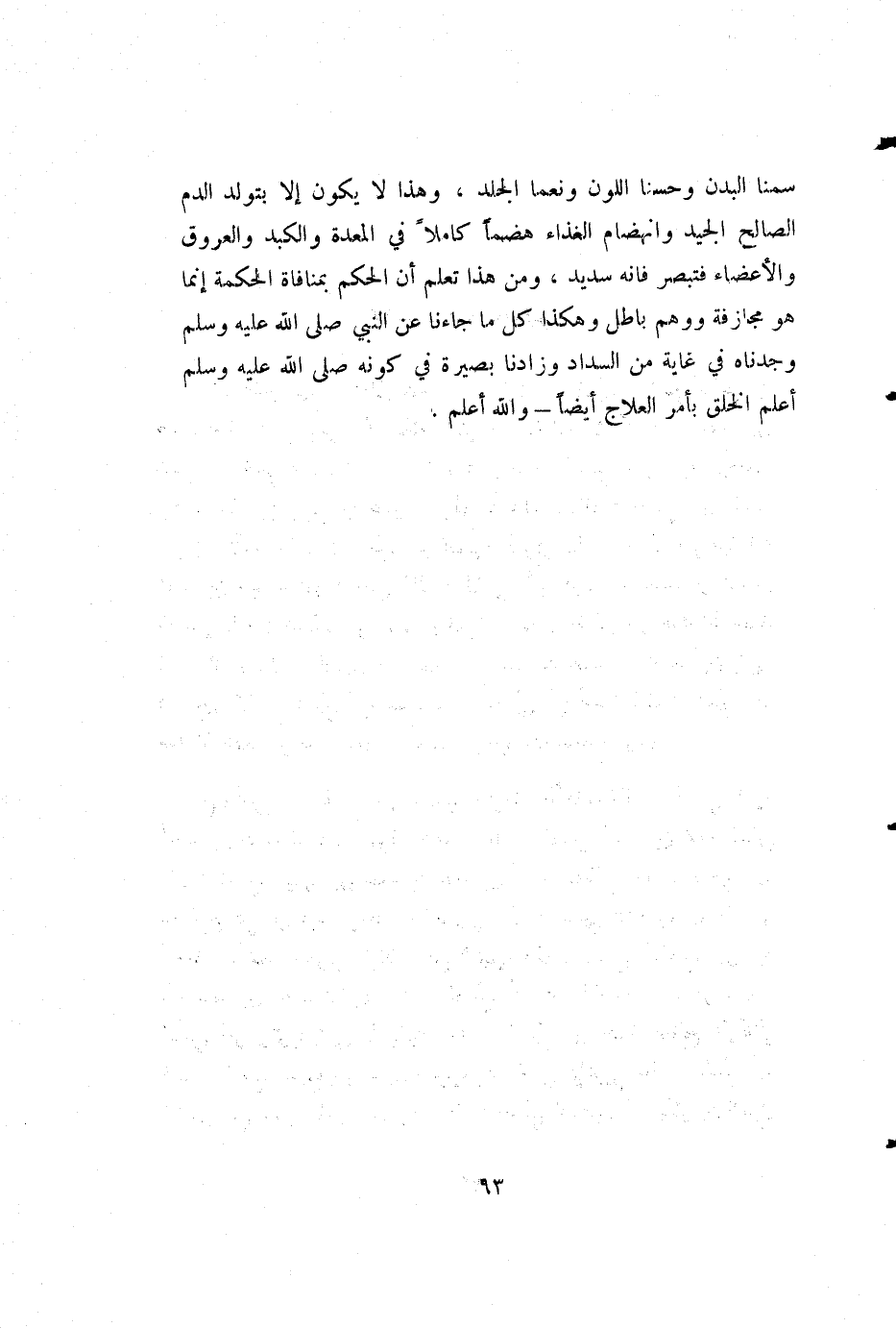 سمنا البدن وحسنا اللون ونعما الجلد، وهذا لا يكون إلا بتولد الدم الصالح الجيد وانهضام الغذاء هضما كاملا في المعدة والكبد والعروق والأعضاء فتبصر فإنه سديد، ومن هذا تعلم أن الحكم بمنافاة الحكمة إنما هو مجازفة ووهم باطل وهكذا كل ما جاءنا عن النبي صلى الله عليه وسلم وجدناه في غاية من السداد وزادنا بصيرة في كونه صلى الله عليه وسلم أعلم الخلق بأمر العلاج أيضا - والله أعلم.