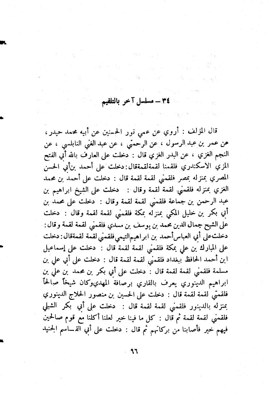 قال المؤلف: أروي عن عمي نور الحسنين عن أبيه محمد حيدر، عن عمر بن عبد الرسول، عن الرحمي، عن عبد الغني النابلسي، عن النجم الغزي، عن البدر الغزي قال: دخلت على العارف بالله أبي الفتح المزي الإسكندري فلقمنا لقمة لقمة قال: دخلت على أحمد بن أبي الحسن المصري بمنزله بمصر فلقمني لقمة لقمة قال: دخلت على أحمد بن محمد الغزي بمنزله فلقمني لقمة لقمة وقال: دخلت على الشيخ إبراهيم بن عبد الرحمن بن جماعة فلقمني لقمة لقمة وقال: دخلت على محمد بن أبي بكر بن خليل المكي بمنزله بمكة فلقمني لقمة لقمة وقال: دخلت على الشيخ جمال الدين محمد بن يوسف بن مسدي فلقمني لقمة لقمة وقال: دخلت على أبي العباس أحمد بن إبراهيم التيمي فلقمني لقمة لقمة قال: دخلت على المبارك بن علي بمكة فلقمني لقمة لقمة قال: دخلت على إسماعيل بن أحمد الحافظ ببغداد فلقمني لقمة لقمة قال: دخلت على أبي علي بن مسلمة فلقمني لقمة لقمة قال: دخلت على أبي بكر بن محمد بن علي بن إبراهيم الدينوري يعرف بالقاري برصافة المهدي وكان شيخا صالحا فلقمني لقمة لقمة قال: دخلت على الحسين بن منصور الحلاج الدينوري بمنزله بالدينور فلقمني لقمة لقمة قال: دخلت على أبي بكر الشبلي فلقمني لقمة لقمة ثم قال: كل ما فينا خير لعلنا أكلنا مع قوم صالحين فيهم خير فأصابنا من بركاتهم ثم قال: دخلت على أبي القاسم الجنيد