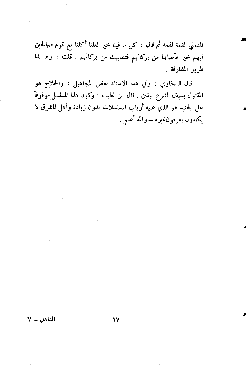 قال السخاوي: وفي هذا الإسناد بعض المجاهيل، والحلاج هو المقتول بسيف الشرع بيقين. قال ابن الطيب: وكون هذا المسلسل موقوفا على الجنيد هو الذي عليه أرباب المسلسلات بدون زيادة وأهل المشرق لا يكادون يعرفون غيره - والله أعلم.