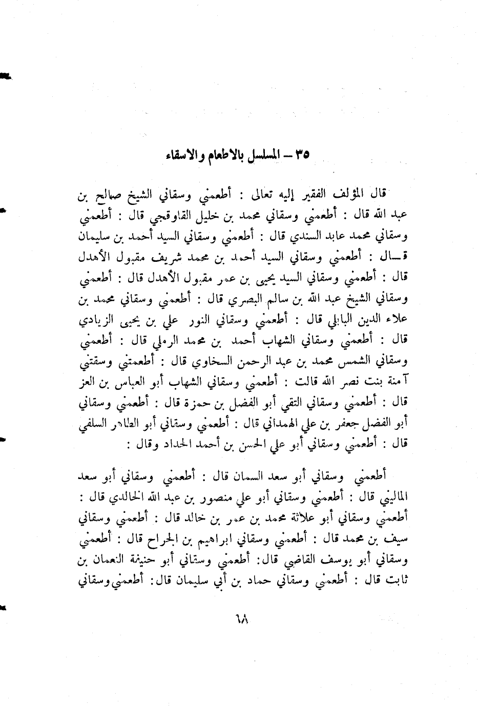 قال المؤلف الفقير إليه تعالى: أطعمني وسقاني الشيح صالح بن عبد الله قال: أطعمني وسقاني محمد بن خليل القاوقجي قال: أطعمني وسقاني محمد عابد السندي قال: أطعمني وسقاني السيد أحمد بن سليمان قال: أطعمني وسقاني السيد أحمد بن محمد شريف مقبول الأهدل قال: أطعمني وسقاني السيد يحيى بن عمر مقبول الأهدل قال: أطعمني وسقاني الشيخ عبد الله بن سالم البصري قال: أطعمني وسقاني محمد بن علاء الدين البابلي قال: أطعمني وسقاني النور علي بن يحيى الزيادي قال: أطعمني وسقاني الشهاب أحمد بن محمد الرملي قال: أطعمني وسقاني الشمس محمد بن عبد الرحمن السخاوي قال: أطعمتني وسقتني آمنة بنت نصر الله قالت: أطعمني وسقاني الشهاب أبو العباس بن العز قال: أطعمني وسقاني التقي أبو الفضل بن حمزة قال: أطعمني وسقاني أبو الفضل جعفر بن علي الهمداني قال: أطعمني وسقاني أبو الطاهر السلفي قال: أطعمني وسقاني أبو علي الحسن بن أحمد الحداد وقال: