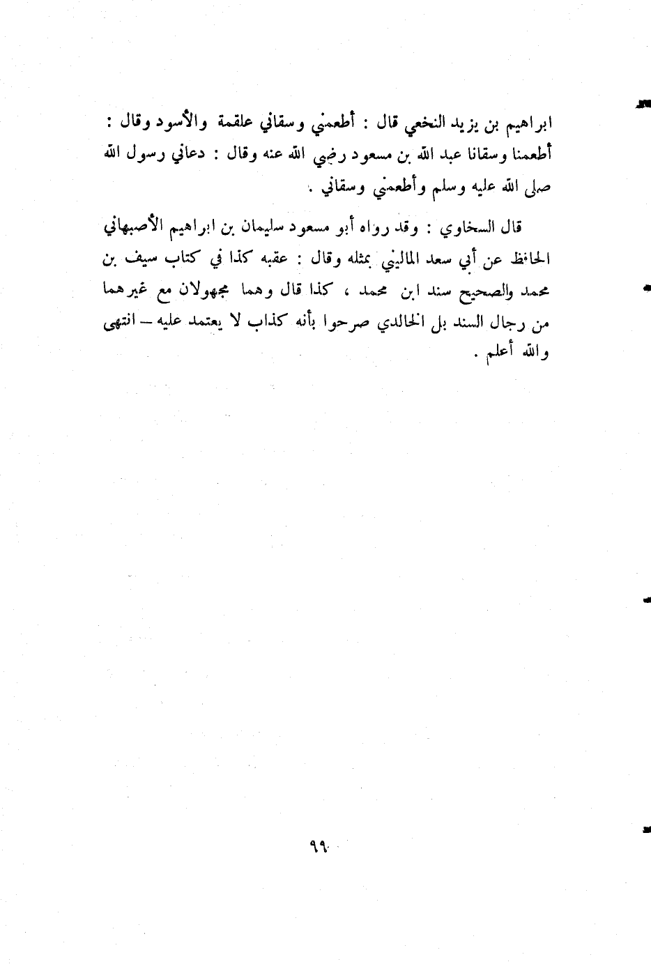 إبراهيم بن يزيد النخعي قال: أطعمني وسقاني علقمة والأسود وقال: أطعمنا وسقانا عبد الله بن مسعود رضي الله عنه وقال: دعاني رسول الله صلى الله عليه وسلم وأطعمني وسقاني.