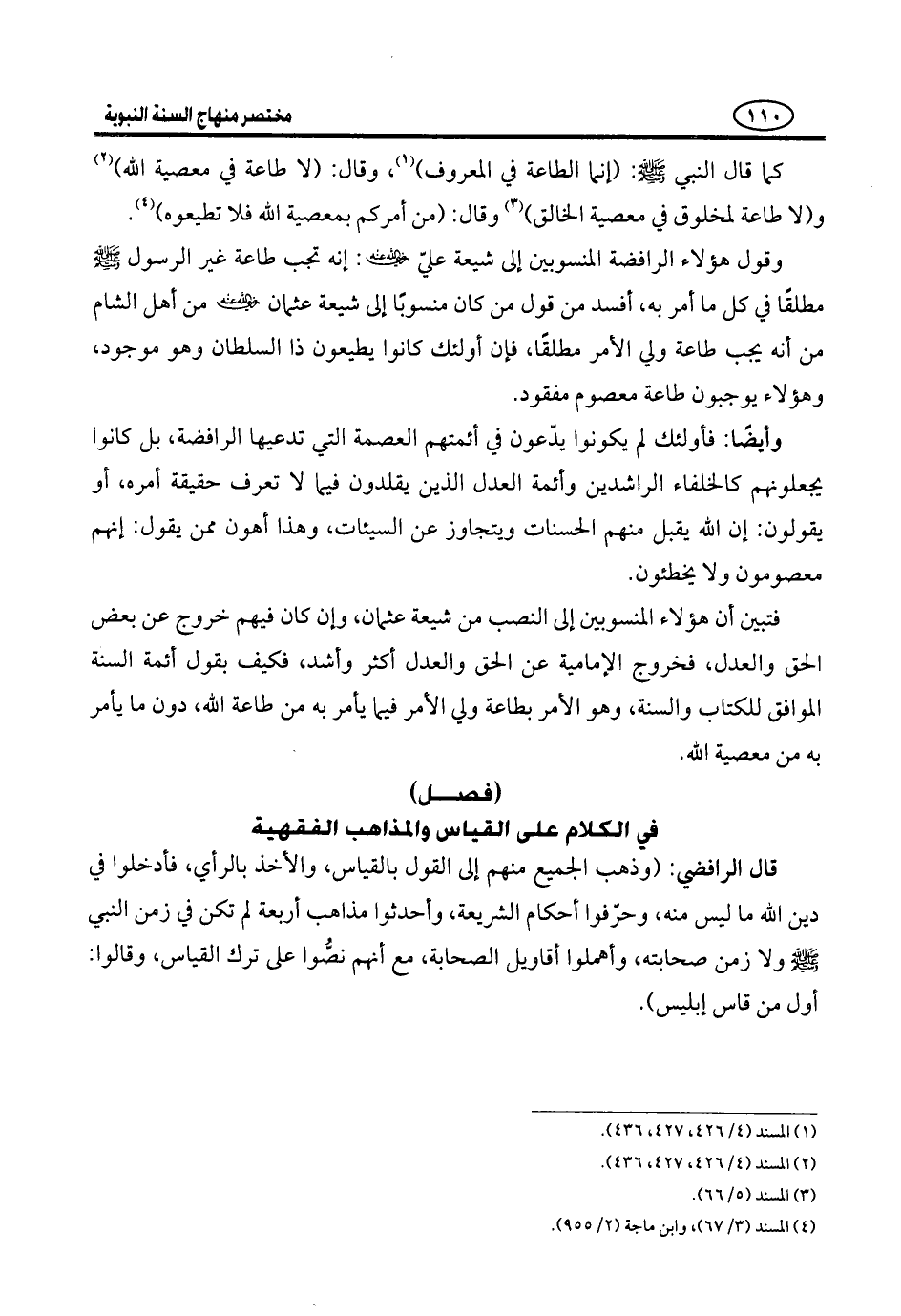 أَحَدُهَا: أَنَّ دَعْوَاهُ عَلَى جَمِيعِ أَهْلِ السُّنَّةِ الْمُثْبِتِينَ لِإِمَامَةِ الْخُلَفَاءِ الثَّلَاثَةِ أَنَّهُمْ يَقُولُونَ بِالْقِيَاسِ دَعْوَى باطلة، قد عُرف فِيهِمْ طَوَائِفُ لَا يَقُولُونَ بِالْقِيَاسِ، كَالْمُعْتَزِلَةِ الْبَغْدَادِيِّينَ، وَكَالظَّاهِرِيَّةِ كَدَاوُدَ وَابْنِ حَزْمٍ وَغَيْرِهِمَا، وَطَائِفَةٍ مِنْ أَهْلِ الْحَدِيثِ وَالصُّوفِيَّةِ.