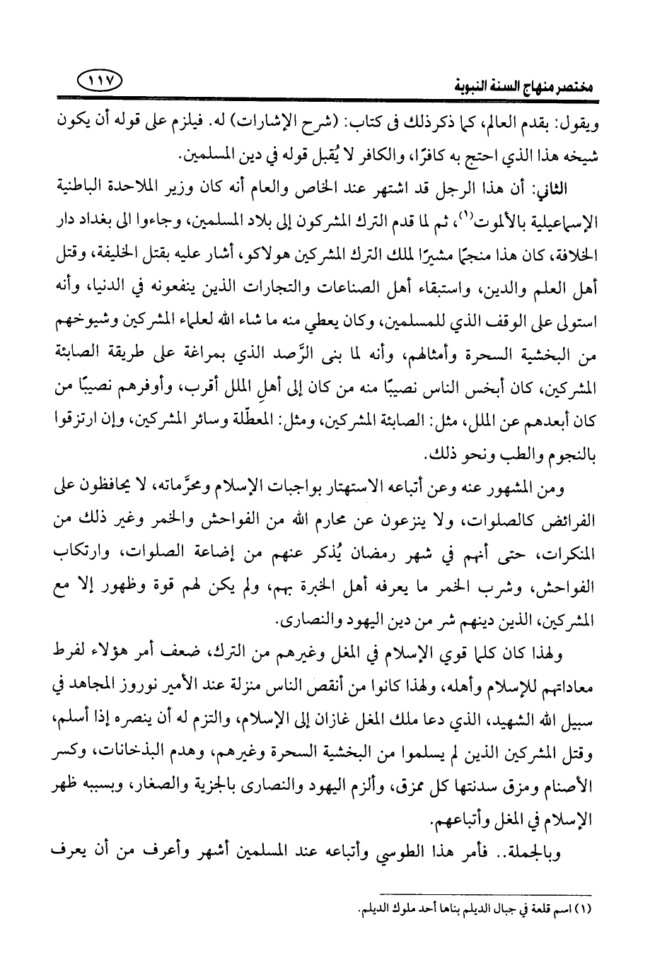 لكن ما ذكره عن هَذَا، إِنْ كَانَ قَبْلَ التَّوْبَةِ لَمْ يُقبل قَوْلُهُ، وَإِنْ كَانَ بَعْدَ التَّوْبَةِ لَمْ يَكُنْ قَدْ تَابَ مِنَ الرَّفْضِ، بَلْ مِنَ الْإِلْحَادِ وحده. وعلى التَّقْدِيرَيْنِ فَلَا يُقبل قَوْلُهُ. وَالْأَظْهَرُ أَنَّهُ إِنَّمَا كَانَ يَجْتَمِعُ بِهِ وَبِأَمْثَالِهِ لَمَّا كَانَ مَنَجِّمًا لِلْمُغْلِ الْمُشْرِكِينَ، وَالْإِلْحَادُ مَعْرُوفٌ مِنْ حَالِهِ إِذْ ذلك.