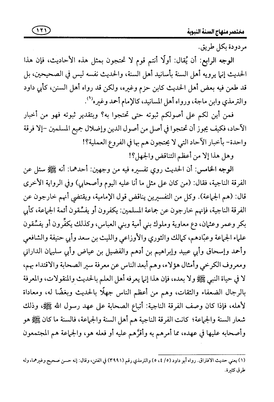 عَنِ الْجَمَاعَةِ قَدْ برَّأ اللَّهُ نَبِيَّهُ مِنْهُمْ، فعُلم بِذَلِكَ أَنَّ هَذَا وَصْفُ أَهْلِ السُّنَّةِ وَالْجَمَاعَةِ، لَا وَصْفُ الرَّافِضَةِ، وَأَنَّ هَذَا الْحَدِيثَ وَصَفَ الْفِرْقَةِ النَّاجِيَةِ بِاتِّبَاعِ سُنَّتِهِ الَّتِي كَانَ عَلَيْهَا هُوَ وَأَصْحَابُهُ، وَبِلُزُومِ جَمَاعَةِ الْمُسْلِمِينَ.