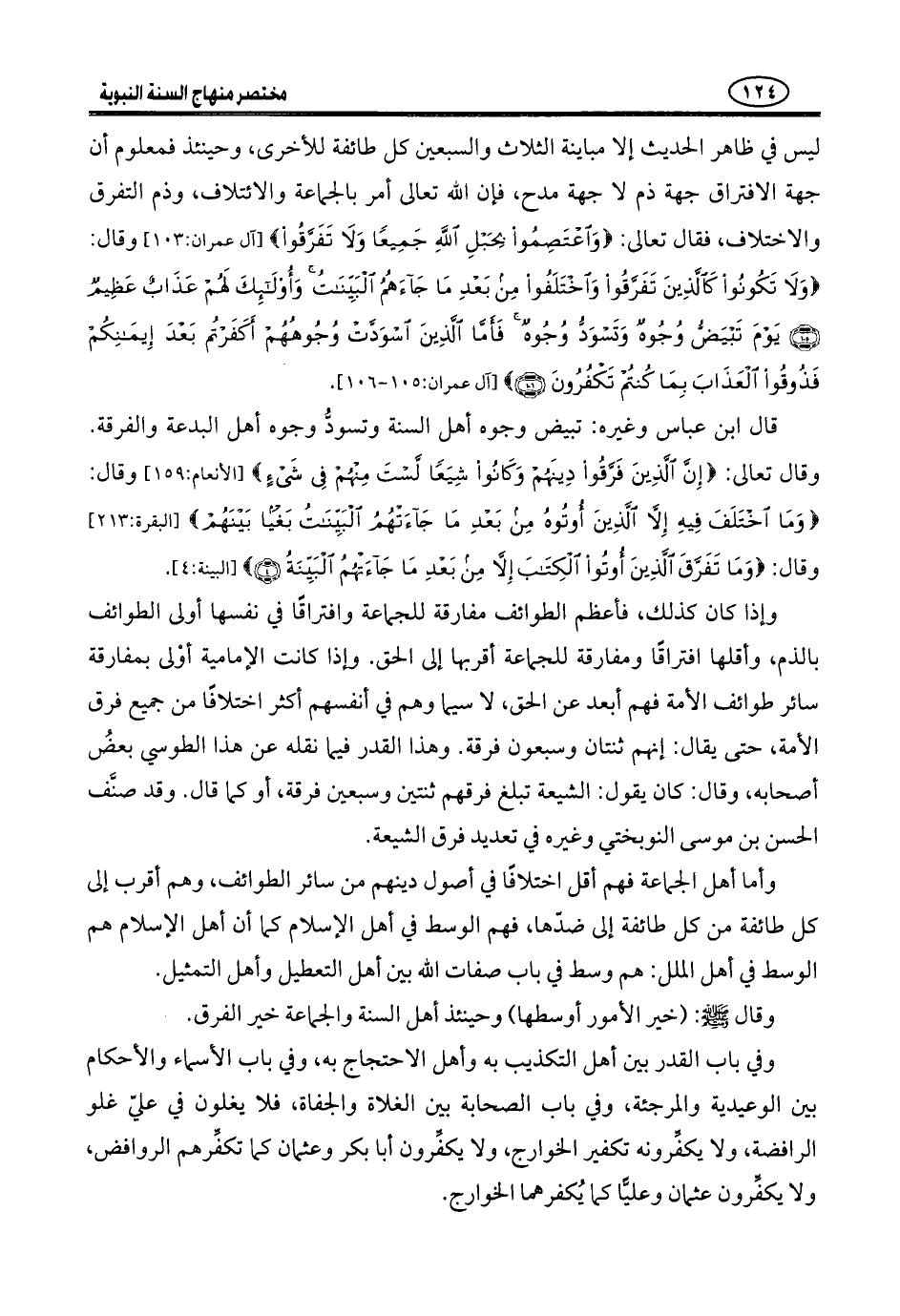 وَهَؤُلَاءِ الْإِمَامِيَّةُ الِاثْنَا عَشْرِيَّةَ يَقُولُونَ: إِنَّ أُصُولَ الدِّينِ أَرْبَعَةٌ: التَّوْحِيدُ، وَالْعَدْلُ، وَالنُّبُوَّةُ، وَالْإِمَامَةُ. وَهُمْ مُخْتَلِفُونَ فِي التَّوْحِيدِ وَالْعَدْلِ وَالْإِمَامَةِ. وَأَمَّا النُّبُوَّةُ فَغَايَتُهُمْ أَنْ يَكُونُوا مقرِّين بِهَا كَإِقْرَارِ سَائِرِ الْأُمَّةِ. وَاخْتِلَافُهُمْ فِي الْإِمَامَةِ أَعْظَمُ مِنِ اخْتِلَافِ سَائِرِ الْأُمَّةِ، فَإِنْ قَالَتِ الِاثْنَا عَشْرِيَّةَ: نَحْنُ أَكْثَرُ مِنْ هَذِهِ الطَّوَائِفِ، فَيَكُونُ الْحَقُّ مَعَنَا دُونَهُمْ. قِيلَ لَهُمْ: وَأَهْلُ السُّنَّةِ أَكْثَرُ مِنْكُمْ، فَيَكُونُ الْحَقُّ مَعَهُمْ دُونَكُمْ، فَغَايَتُكُمْ أَنْ تَكُونَ سَائِرُ فِرَقِ الْإِمَامِيَّةِ مَعَكُمْ بِمَنْزِلَتِكُمْ مَعَ سَائِرِ الْمُسْلِمِينَ، وَالْإِسْلَامُ هُوَ دِينُ اللَّهِ الَّذِي يَجْمَعُ أهل الحق.