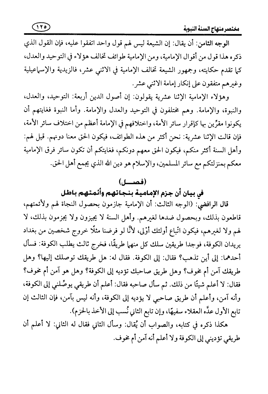 فَتَبَيَّنَ أَنَّهُ إِنْ كَانَتْ حُجَّةُ هَؤُلَاءِ الْمُنْتَسِبِينَ إلى مشايعة علي ّ - رَضِيَ اللَّهُ عَنْهُ - صَحِيحَةً، فَحُجَّةُ أُولَئِكَ الْمُنْتَسِبِينَ إِلَى مُشَايَعَةِ عُثْمَانَ - رَضِيَ اللَّهُ عَنْهُ - أوْلى بِالصِّحَّةِ، وَإِنْ كَانَتْ بَاطِلَةً فَهَذِهِ أَبْطَلُ مِنْهَا. فَإِذَا كَانَ هَؤُلَاءِ الشِّيعَةُ مُتَّفِقِينَ مَعَ سَائِرِ أَهْلِ السُّنَّةِ عَلَى أَنَّ جَزْمَ أُولَئِكَ بِنَجَاتِهِمْ إِذَا أَطَاعُوا أُولَئِكَ الْأَئِمَّةَ طَاعَةً مُطْلَقَةً خَطَأٌ وَضَلَالٌ، فَخَطَأُ هَؤُلَاءِ وَضَلَالُهُمْ إِذَا جَزَمُوا بِنَجَاتِهِمْ لِطَاعَتِهِمْ لِمَنْ يَدَّعِي أَنَّهُ نَائِبُ الْمَعْصُومِ - وَالْمَعْصُومُ لَا عَيْنَ لَهُ وَلَا أَثَرَ - أَعْظَمُ وَأَعْظَمُ؛ فَإِنَّ الشِّيعَةَ لَيْسَ لَهُمْ أَئِمَّةٌ يُبَاشِرُونَهُمْ بِالْخِطَابِ، إِلَّا شُيُوخَهُمُ الَّذِينَ يَأْكُلُونَ أَمْوَالَهُمْ بِالْبَاطِلِ، وَيَصُدُّونَهُمْ عَنْ سَبِيلِ اللَّهِ.