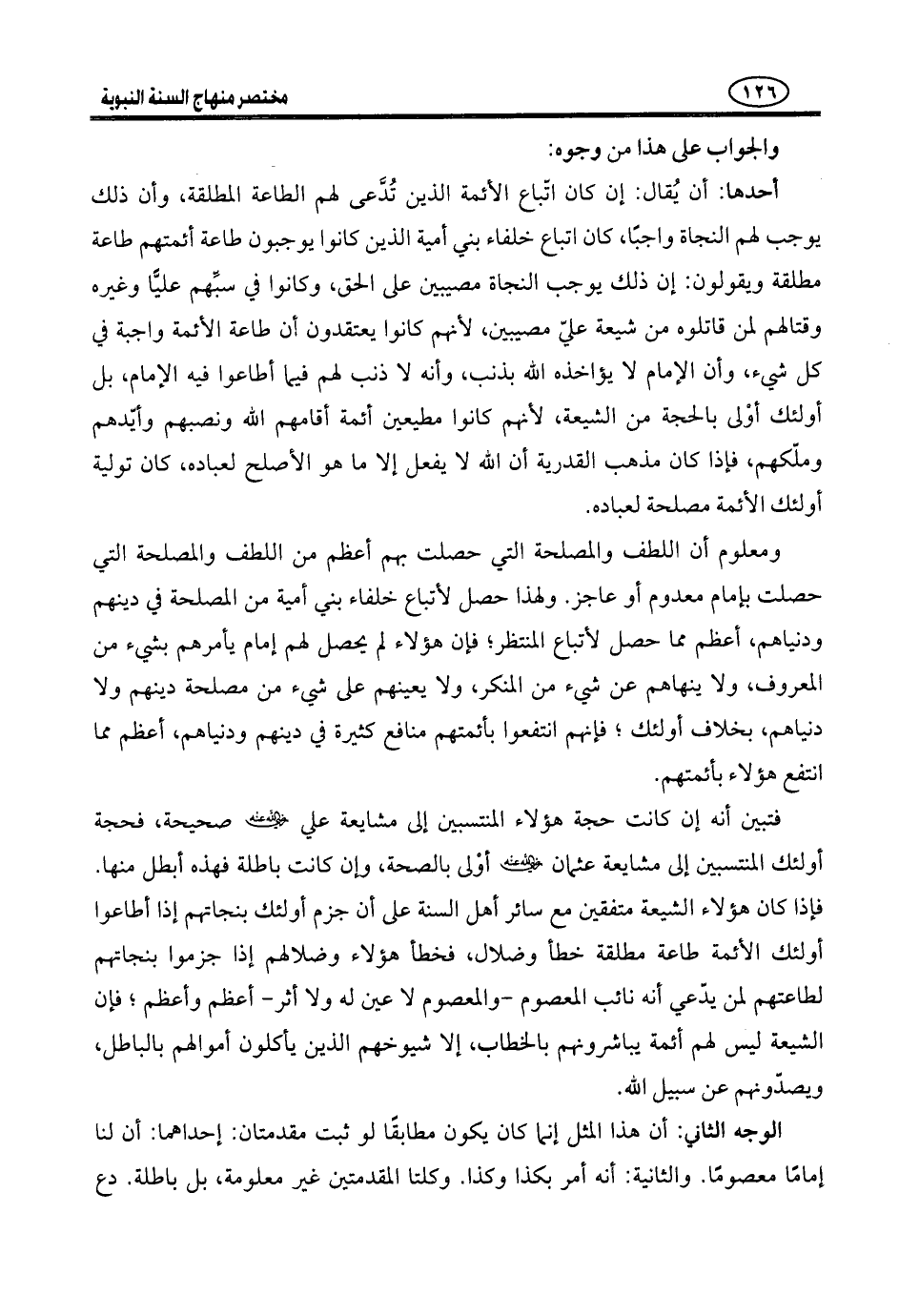 الْمُقَدِّمَةَ الْأُولَى، بَلِ الثَّانِيَةَ، فَإِنَّ الْأَئِمَّةَ الَّذِينَ يُدَّعَى فِيهِمُ الْعِصْمَةُ قَدْ مَاتُوا مُنْذُ سِنِينَ كَثِيرَةٍ، وَالْمُنْتَظَرُ لَهُ غَائِبٌ أَكْثَرَ مِنْ أَرْبَعِمِائَةٍ وَخَمْسِينَ سَنَةً، وَعِنْدَ آخَرِينَ هُوَ مَعْدُومٌ لَمْ يُوجَدْ. وَالَّذِينَ يُطاعون شُيُوخٌ مِنْ شُيُوخِ الرَّافِضَةِ، أَوْ كُتُبٌ صَنَّفَهَا بَعْضُ شُيُوخِ الرَّافِضَةِ، وَذَكَرُوا أَنَّ مَا فِيهَا مَنْقُولٌ عَنْ أُولَئِكَ الْمَعْصُومِينَ. وَهَؤُلَاءِ الشُّيُوخُ المصنِّفون لَيْسُوا مَعْصُومِينَ بِالِاتِّفَاقِ، وَلَا مَقْطُوعًا لَهُمْ بِالنَّجَاةِ.