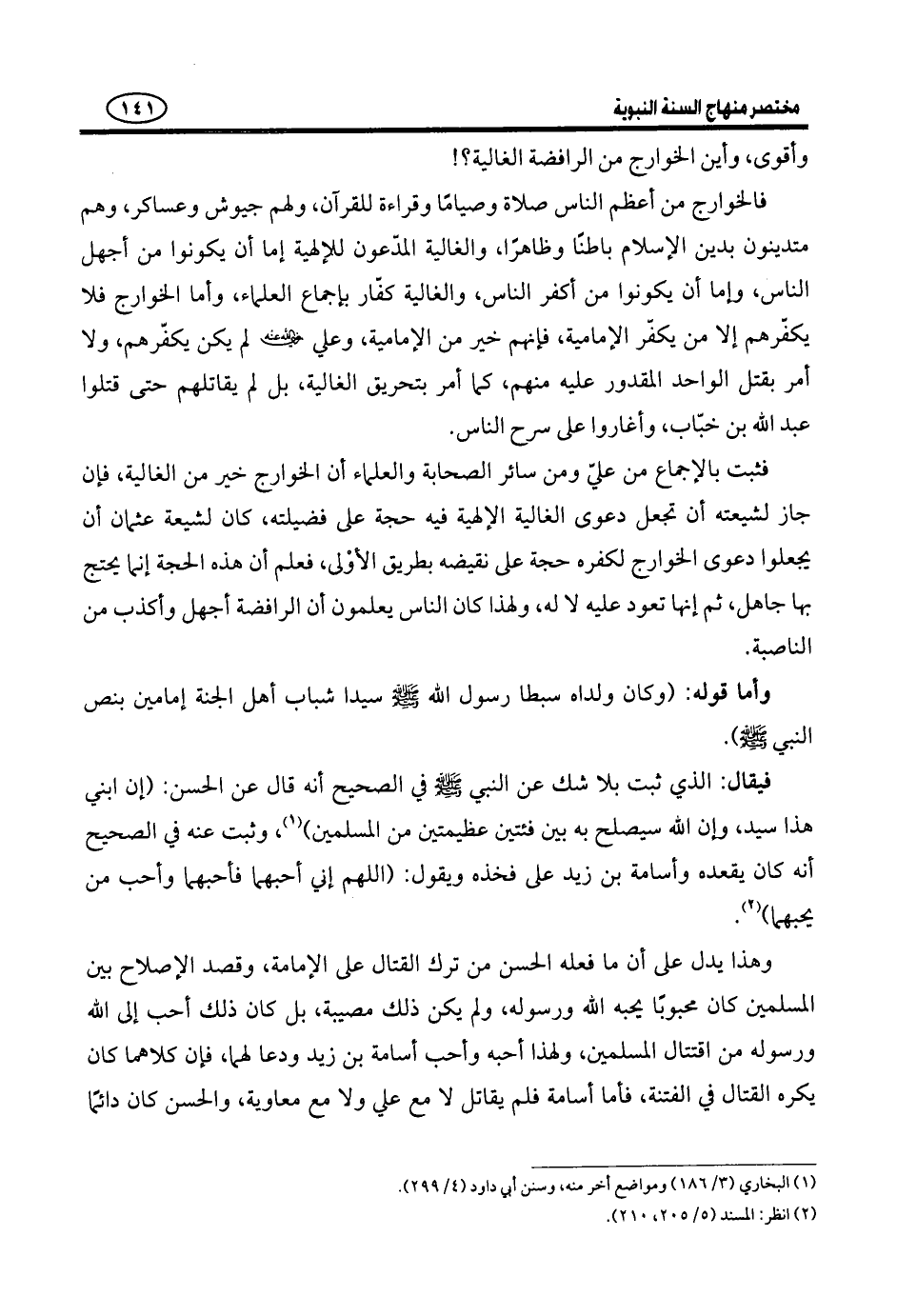 ثُمَّ إِنْ كَانَ النَّبِيُّ - صَلَّى اللَّهُ عَلَيْهِ وَسَلَّمَ - جَعَلَهُمَا إِمَامَيْنِ لَمْ يَكُونَا قَدِ اسْتَفَادَا الْإِمَامَةَ بِنَصِّ عَلِيٍّ، وَلَاسْتَفَادَهَا الْحُسَيْنُ بِنَصِّ الْحَسَنِ عَلَيْهِ، وَلَا رَيْبَ أَنَّ الْحَسَنَ وَالْحُسَيْنَ رَيْحَانَتَا النَّبِيِّ - صَلَّى اللَّهُ عَلَيْهِ وَسَلَّمَ - فِي الدُّنْيَا. وَقَدْ ثَبَتَ أَنَّهُ - صَلَّى اللَّهُ عَلَيْهِ وَسَلَّمَ - أَدْخَلَهُمَا مَعَ أَبَوَيْهِمَا تَحْتَ الْكِسَاءِ، وَقَالَ: ((اللَّهُمَّ هَؤُلَاءِ أَهْلُ بَيْتِي فَأَذْهِبْ عَنْهُمُ الرِّجْسَ وطهِّرهم تَطْهِيرًا)) وأنه دعالهما فِي الْمُبَاهَلَةِ، وَفَضَائِلُهُمَا كَثِيرَةٌ، وَهُمَا مِنْ أَجِلَّاءِ سَادَاتِ الْمُؤْمِنِينَ. وَأَمَّا كَوْنُهُمَا أَزْهَدَ النَّاسِ وَأَعْلَمَهُمْ فِي زَمَانِهِمْ فَهَذَا قَوْلٌ بِلَا دَلِيلٍ.