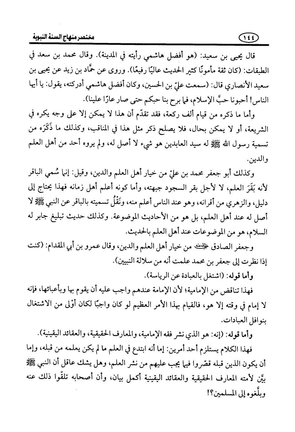 وَهَذَا يَقْتَضِي الْقَدْحَ: إِمَّا فِيهِ، وَإِمَّا فِيهِمْ. بَلْ كُذِب عَلَى جَعْفَرٍ الصَّادِقِ أَكْثَرَ مِمَّا كُذِب عَلَى مَنْ قَبْلَهُ، فَالْآفَةُ وَقَعَتَ مِنَ الكذَّابين عَلَيْهِ لَا مِنْهُ. وَلِهَذَا نُسب إِلَيْهِ أَنْوَاعٌ مِنَ الْأَكَاذِيبِ، مِثْلَ كِتَابِ ((الْبِطَاقَةِ)) وَ ((الجَفْر)) و ((الهَفْت)) والكلام في النجوم.