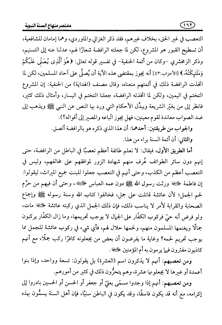 وَكَذَلِكَ مِنْ جَهْلِهِمْ وَتَعَصُّبِهِمْ أَنَّهُمْ يُبْغِضُونَ أَهْلَ الشَّامِ، لِكَوْنِهِمْ كَانَ فِيهِمْ أَوَّلًا مَنْ يُبْغِضُ عَلِيًّا. وَمَعْلُومٌ أَنَّ مَكَّةَ كَانَ فِيهَا كفّار ومؤمنون، وكذلك المدينة كَانَ فِيهَا مُؤْمِنُونَ وَمُنَافِقُونَ، وَالشَّامُ فِي هَذِهِ الْأَعْصَارِ لَمْ يَبْقَ فِيهِ مَنْ يَتَظَاهَرُ بِبُغْضِ عَلِيٍّ، وَلَكِنْ لِفَرْطِ جَهْلِهِمْ يَسْحَبُونَ ذَيْلَ الْبُغْضِ. وَكَذَلِكَ مِنْ جَهْلِهِمْ أَنَّهُمْ يَذُمُّونَ مَنْ يَنْتَفِعُ بِشَيْءٍ مِنْ آثَارِ بَنِي أُمَيَّةَ، كَالشُّرْبِ مِنْ نَهْرِ يَزِيدَ، وَيَزِيدُ لَمْ يَحْفِرْهُ وَلَكِنْ وسَّعه، وَكَالصَّلَاةِ فِي جَامِعٍ بَنَاهُ بَنُو أُمَيَّةَ. وَمِنَ الْمَعْلُومِ أَنَّ النَّبِيَّ - صَلَّى اللَّهُ عَلَيْهِ وَسَلَّمَ - كَانَ يصلِّي إِلَى الْكَعْبَةِ الَّتِي بَنَاهَا الْمُشْرِكُونَ، وَكَانَ يَسْكُنُ فِي الْمَسَاكِنِ الَّتِي بَنَوْهَا، وَكَانَ يَشْرَبُ مِنْ مَاءِ الْآبَارِ الَّتِي حَفَرُوهَا، وَيَلْبَسُ مِنَ الثِّيَابِ الَّتِي نَسَجُوهَا، وَيُعَامِلُ بِالدَّرَاهِمِ الَّتِي ضَرَبُوهَا. فَإِذَا كَانَ يَنْتَفِعُ بِمَسَاكِنِهِمْ وَمَلَابِسِهِمْ، وَالْمِيَاهِ الَّتِي أَنْبَطُوهَا، وَالْمَسَاجِدِ الَّتِي بَنَوْهَا، فَكَيْفَ بِأَهْلِ القبلة؟ !