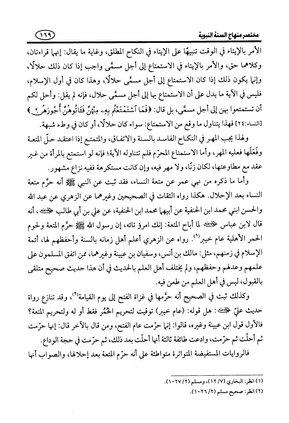 بَعْدَ أَنْ حُرِّمَتْ لَمْ تُحل، وَأَنَّهَا إِنَّمَا حُرِّمَتْ عَامَ فَتْحِ مَكَّةَ وَلَمْ تُحل بَعْدَ ذَلِكَ، وَلَمْ تُحَرَّمْ عَامَ خَيْبَرَ، بَلْ عَامَ خَيْبَرَ حُرِّمَتْ لُحُومُ الحُمُر الْأَهْلِيَّةِ. وَكَانَ ابْنُ عَبَّاسٍ يُبِيحُ الْمُتْعَةَ وَلُحُومَ الحُمُر فَأَنْكَرَ عَلِيُّ بْنُ أَبِي طَالِبٍ - رَضِيَ اللَّهُ عَنْهُ - ذَلِكَ عَلَيْهِ، وَقَالَ لَهُ: إِنَّ رَسُولَ اللَّهِ - صَلَّى اللَّهُ عَلَيْهِ وَسَلَّمَ - حَرَّمَ مُتْعَةَ النِّسَاءِ وَحَرَّمَ لحوم الحمر يوم خيبر، فقرن علي ّ - رَضِيَ اللَّهُ عَنْهُ - بَيْنَهُمَا فِي الذِّكْرِ لَمَّا روى ذلك لابن عباس رضى الله عنهمما، لِأَنَّ ابْنَ عَبَّاسٍ كَانَ يُبِيحُهُمَا. وَقَدْ رَوَى عن ابْنُ عَبَّاسٍ - رَضِيَ اللَّهُ عَنْهُ - أَنَّهُ رَجَعَ عَنْ ذَلِكَ لَمَّا بَلَغَهُ حَدِيثُ النَّهْيِ عَنْهُمَا.