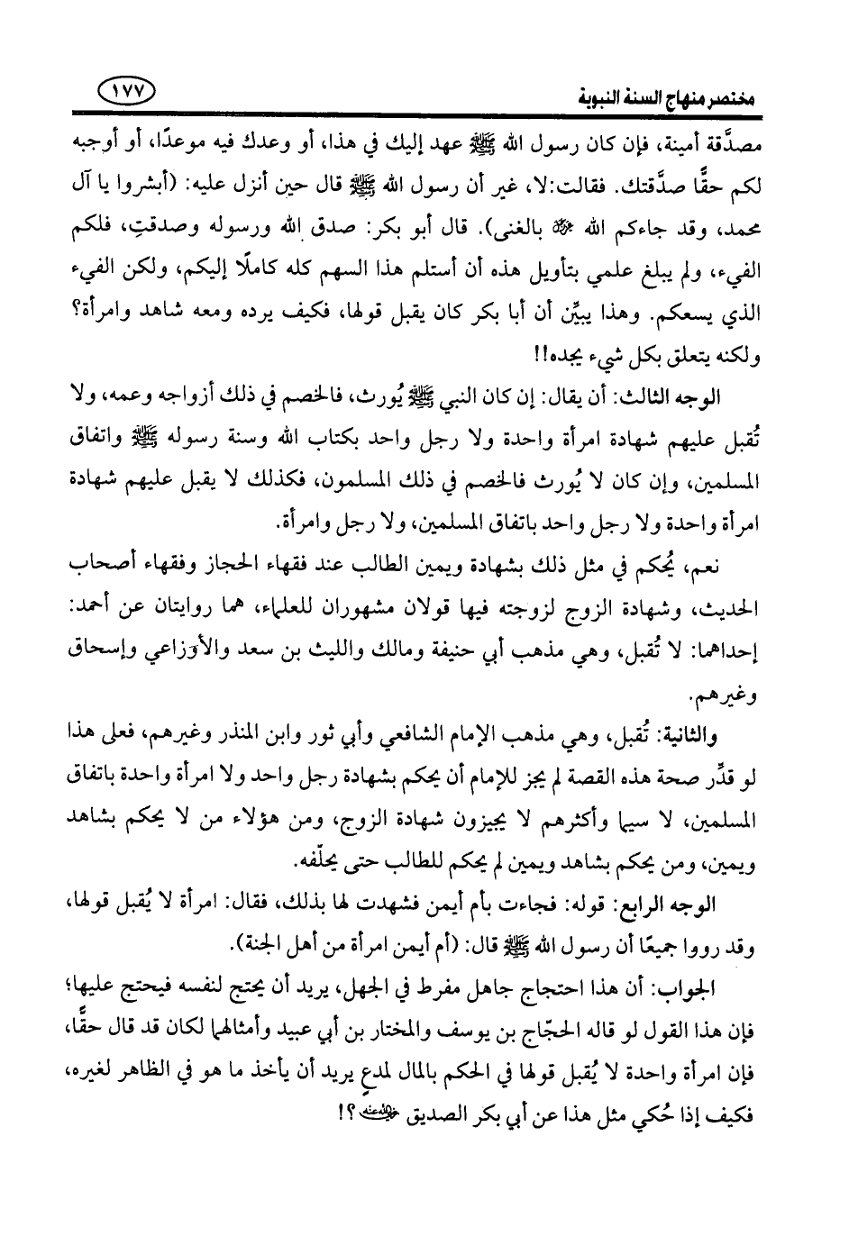 وَأَمَّا الْحَدِيثُ الَّذِي ذَكَرَهُ وَزَعَمَ أَنَّهُمْ رَوَوْهُ جَمِيعًا، فَهَذَا الْخَبَرُ لَا يُعْرَفُ فِي شَيْءٍ مِنْ دَوَاوِينِ الْإِسْلَامِ وَلَا يُعرف عَالِمٌ مِنْ علماء الحديث رواه. وأم أَيْمَنَ هِيَ أُمُّ أُسَامَةَ بْنِ زَيْدٍ، وَهِيَ حَاضِنَةُ النَّبِيِّ - صَلَّى اللَّهُ عَلَيْهِ وَسَلَّمَ -، وَهِيَ مِنَ الْمُهَاجِرَاتِ، وَلَهَا حَقٌّ وَحُرْمَةٌ، لَكِنَّ الرِّوَايَةَ عَنِ النَّبِيِّ - صَلَّى اللَّهُ عَلَيْهِ وَسَلَّمَ - لَا تَكُونُ بِالْكَذِبِ عَلَيْهِ وَعَلَى أَهْلِ الْعِلْمِ. وَقَوْلُ الْقَائِلِ: ((رَوَوْا جَمِيعًا)) لَا يَكُونُ إِلَّا فِي خَبَرٍ مُتَوَاتِرٍ، فَمَنْ يُنْكِرُ حَدِيثَ النَّبِيِّ - صَلَّى اللَّهُ عَلَيْهِ وَسَلَّمَ - أَنَّهُ لَا يُورث، وَقَدْ رَوَاهُ أَكَابِرُ الصَّحَابَةِ، وَيَقُولُ: إِنَّهُمْ جَمِيعًا رَوَوْا هَذَا الْحَدِيثَ، إِنَّمَا يَكُونُ مِنْ أَجْهَلِ النَّاسِ وأعظمهم جحداً للحق.