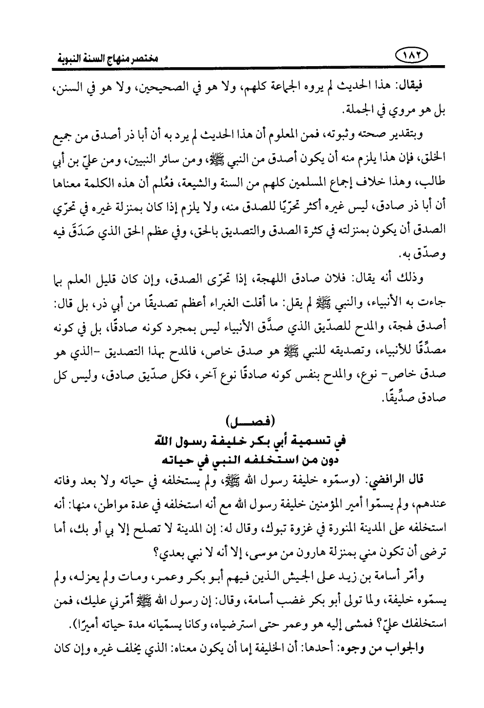 وَأَمَّا إِنْ قِيلَ: إِنَّ الْخَلِيفَةَ مَنِ اسْتَخْلَفَهُ غيره، كما قاله بعض أهل السنة وَبَعْضُ الشِّيعَةِ، فَمَنْ قَالَ هَذَا مِنْ أَهْلِ السُّنَّةِ فَإِنَّهُ يَقُولُ: إِنَّ النَّبِيَّ - صَلَّى اللَّهُ عَلَيْهِ وَسَلَّمَ - اسْتَخْلَفَ أَبَا بَكْرٍ إِمَّا بِالنَّصِّ الجليّ، كما قال بَعْضُهُمْ، وَإِمَّا بِالنَّصِّ الْخَفِيِّ. كَمَا أَنَّ الشِّيعَةَ الْقَائِلِينَ بِالنَّصِّ عَلَى عَلِيٍّ مِنْهُمْ مَنْ يَقُولُ بِالنَّصِّ الْجَلِيِّ، كَمَا تَقُولُهُ الْإِمَامِيَّةُ، وَمِنْهُمْ مَنْ يَقُولُ بِالنَّصِّ الْخَفِيِّ، كَمَا تَقُولُهُ الْجَارُودِيَّةُ مِنَ الزَّيْدِيَّةِ. وَدَعْوَى أُولَئِكَ لِلنَّصِّ الْجَلِيِّ أَوِ الْخَفِيِّ عَلَى أَبِي بَكْرٍ أَقْوَى وَأَظْهَرُ بِكَثِيرٍ مِنْ دَعْوَى هَؤُلَاءِ لِلنَّصِّ عَلَى عَلِيٍّ، لِكَثْرَةِ النُّصُوصِ الدَّالَّةِ عَلَى ثُبُوتِ خِلَافَةِ أَبِي بَكْرٍ، وَأَنَّ عَلِيًّا لَمْ يَدُلَّ عَلَى خِلَافَتِهِ إِلَّا مَا يُعلم أَنَّهُ كَذِبٌ، أَوْ يُعلم أَنَّهُ لَا دَلَالَةَ فِيهِ.