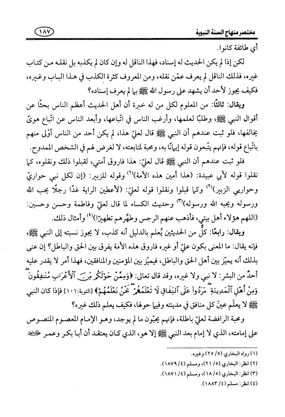 ظَالِمَانِ مُعْتَدِيَانِ أَوْ كَافِرَانِ، فَإِذَا تَبَيَّنَ لَهُمْ يَوْمَ الْقِيَامَةِ أَنَّ عَلِيًّا لَمْ يَكُنْ أَفْضَلَ مِنْ وَاحِدٍ مِنْ هَؤُلَاءِ، وَإِنَّمَا غَايَتُهُ أَنْ يَكُونَ قَرِيبًا مِنْ أَحَدِهِمْ، وَإِنَّهُ كَانَ مُقِرًّا بِإِمَامَتِهِمْ وَفَضْلِهِمْ، وَلَمْ يَكُنْ مَعْصُومًا لَا هُوَ ولا هم ولا كان منصوصا على إِمَامَتِهِ، تَبَيَّنَ لَهُمْ أَنَّهُمْ لَمْ يَكُونُوا يُحِبُّونَ عَلِيًّا، بَلْ هُمْ مِنْ أَعْظَمِ النَّاسِ بُغْضًا لعلي ّ - رَضِيَ اللَّهُ عَنْهُ - فِي الْحَقِيقَةِ، فَإِنَّهُمْ يُبْغِضُونَ مَنِ اتَّصَفَ بِالصِّفَاتِ الَّتِي كَانَتْ فِي عَلِيٍّ أَكْمَلَ مِنْهَا فِي غَيْرِهِ: مِنْ إِثْبَاتِ إِمَامَةِ الثَّلَاثَةِ وَتَفْضِيلِهِمْ، فَإِنَّ عَلِيًّا - رَضِيَ اللَّهُ عَنْهُ - كَانَ يُفَضِّلُهُمْ ويقرُّ بِإِمَامَتِهِمْ. فتبيَّن أَنَّهُمْ مُبْغِضُونَ لِعَلِيٍّ قَطْعًا.