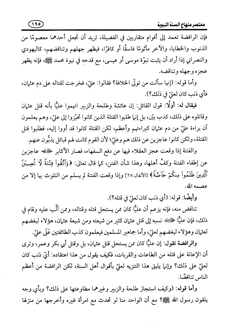 ثُمَّ مِنْ جَهْلِ الرَّافِضَةِ أَنَّهُمْ يُعَظِّمُونَ أَنْسَابَ الْأَنْبِيَاءِ: آبَاءَهُمْ وَأَبْنَاءَهُمْ وَيَقْدَحُونَ فِي أَزْوَاجِهِمْ؛ كُلُّ ذَلِكَ عَصَبِيَّةً وَاتِّبَاعَ هَوًى حَتَّى يُعَظِّمُونَ فَاطِمَةَ والحسن والحسين،