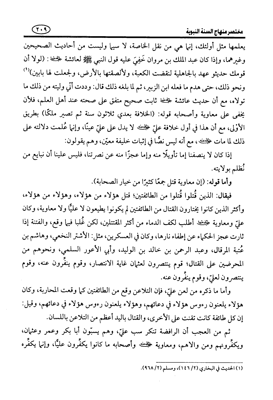 وَلَا رَيْبَ أَنَّهُ لَا يَجُوزُ سَبُّ أَحَدٍ مِنَ الصَّحَابَةِ: لَا عَلِيٍّ وَلَا عُثْمَانَ وَلَا غَيْرِهِمَا، وَمَنْ سَبَّ أَبَا بَكْرٍ وَعُمَرَ وَعُثْمَانَ فهو أعظم إثما ممن سب عليًّا، وَإِنْ كَانَ مُتَأَوِّلًا فَتَأْوِيلُهُ أَفْسَدُ مِنْ تَأْوِيلِ من سب عليًّا.