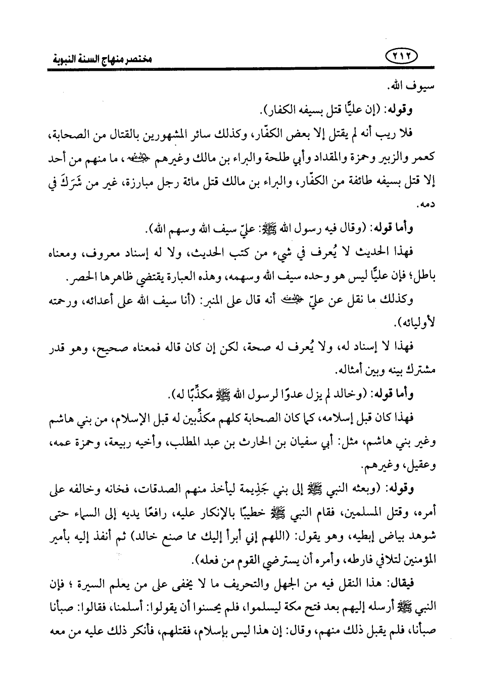 قَالَ الرَّافِضِيُّ: ((وَلَمَّا قُبض النَّبِيُّ - صَلَّى اللَّهُ عَلَيْهِ وَسَلَّمَ - وَأَنْفَذَهُ أَبُو بَكْرٍ لِقِتَالِ أَهْلِ الْيَمَامَةِ قَتَلَ مِنْهُمْ أَلْفًا وَمِائَتَيْ نَفَرٍ مَعَ تَظَاهُرِهِمْ بِالْإِسْلَامِ، وَقَتَلَ مَالِكَ بْنَ نُوَيْرَةَ صَبْرًا وَهُوَ مُسْلِمٌ، وعرَّس بِامْرَأَتِهِ، وَسَمَّوْا بَنِي حَنِيفَةَ أَهْلَ الرِّدَّةِ لِأَنَّهُمْ لَمْ يَحْمِلُوا الزَّكَاةَ إِلَى أَبِي بَكْرٍ لِأَنَّهُمْ لَمْ يَعْتَقِدُوا إِمَامَتَهُ، وَاسْتَحَلَّ دماءهم وأموالهم ونساءهم حَتَّى أَنْكَرَ عُمَرُ عَلَيْهِ، فَسَمَّوْا مَانِعَ الزَّكَاةِ