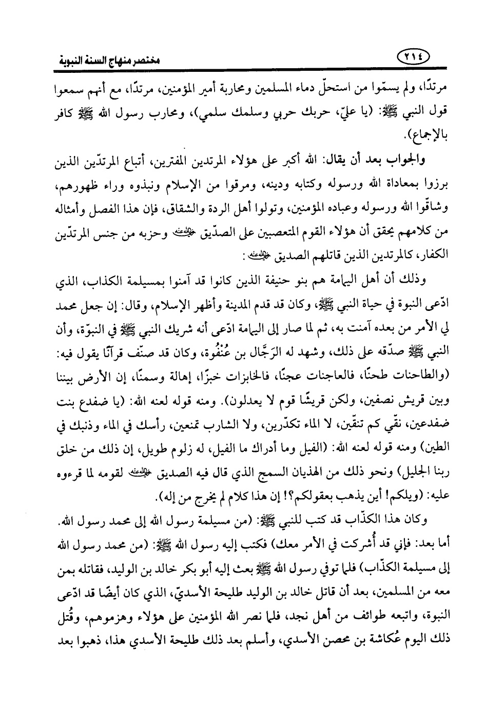 وَهُمْ يَدَّعُونَ أَنَّ أَبَا بَكْرٍ وَعُمَرَ وَمَنِ اتَّبَعَهُمَا ارْتَدُّوا عَنِ الْإِسْلَامِ. وَقَدْ عَلِمَ الْخَاصُّ وَالْعَامُّ أَنَّ أَبَا بَكْرٍ هُوَ الَّذِي قَاتَلَ الْمُرْتَدِّينَ، فَإِذَا كَانُوا يَدَّعُونَ أَنَّ أَهْلَ الْيَمَامَةِ مَظْلُومُونَ قُتلوا بِغَيْرِ حَقٍّ، وَكَانُوا مُنْكِرِينَ لقتال أولئك مُتَأَوِّلِينَ لَهُمْ، كَانَ هَذَا مِمَّا يُحَقِّقُ أَنَّ هؤلاء الخلف تبع لهؤلاء السَّلَفِ، وَأَنَّ الصِّدِّيقَ وَأَتْبَاعَهُ يُقَاتِلُونَ الْمُرْتَدِّينَ فِي كُلِّ زَمَانٍ.