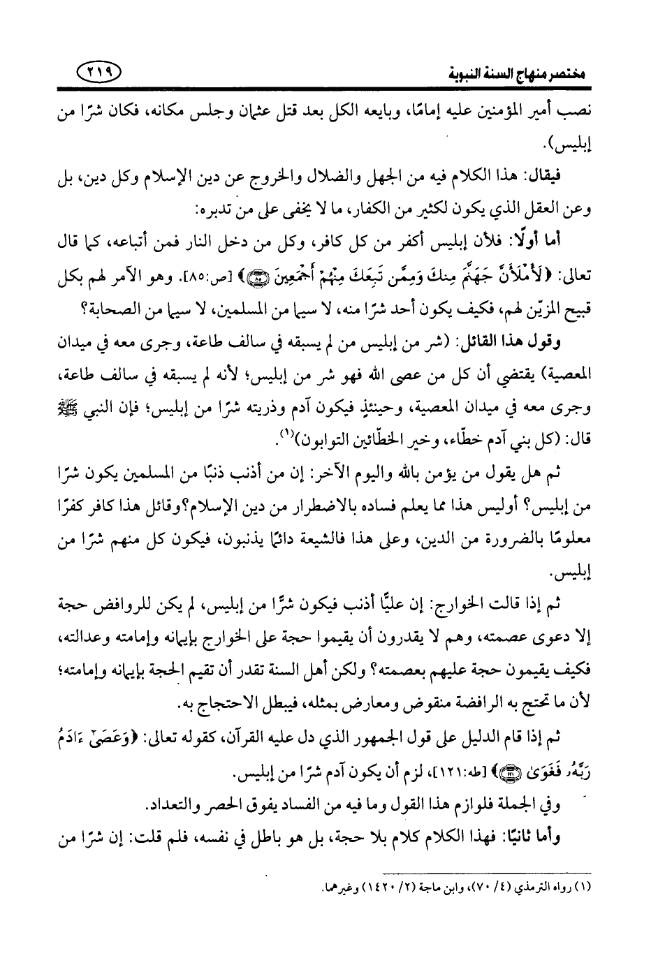 فَيُقَالُ: مَنِ الَّذِي قَالَ هَذَا مِنْ عُلَمَاءِ الصَّحَابَةِ وَالتَّابِعِينَ وَغَيْرِهِمْ مِنْ عُلَمَاءِ الْمُسْلِمِينَ؟ فَضْلًا عَنْ أَنْ يَكُونَ هَذَا مُتَّفَقًا عَلَيْهِ بَيْنَ الْعُلَمَاءِ؟ وَهَذَا شَيْءٌ لَمْ يَقُلْهُ قَطُّ عَالِمٌ يُقْبَلُ قَوْلُهُ مِنْ عُلَمَاءِ الْمُسْلِمِينَ , وَهُوَ أَمْرٌ لَا يُعْرَفُ إِلَّا بِالنَّقْلِ , وَلَمْ يَنْقِلْ هَذَا أَحَدٌ عَنِ النَّبِيِّ - صَلَّى اللَّهُ عَلَيْهِ وَسَلَّمَ - لَا بِإِسْنَادٍ صَحِيحٍ وَلَا ضَعِيفٍ. فَإِنْ كَانَ قَالَهُ بَعْضُ الْوُعَّاظِ أَوِ الْمُصَنِّفِينَ فِي الرَّقَائِقِ , أَوْ بَعْضُ مَنْ يَنْقُلُ فِي التَّفْسِيرِ مِنَ الْإِسْرَائِيلِيَّاتِ مالا إِسْنَادَ لَهُ, فَمِثْلُ هَذَا لَا يُحْتَجُّ بِهِ فِي جُرْزَةِ بَقْلٍ , فَكَيْفَ يُحْتَجُّ بِهِ فِي جَعْلِ إِبْلِيسَ خَيْرًا مِنْ كُلِّ مَنْ عَصَى اللَّهَ مِنْ بَنِي آدَمَ وَيَجْعَلُ الصَّحَابَةَ مِنْ هؤلاء الذين