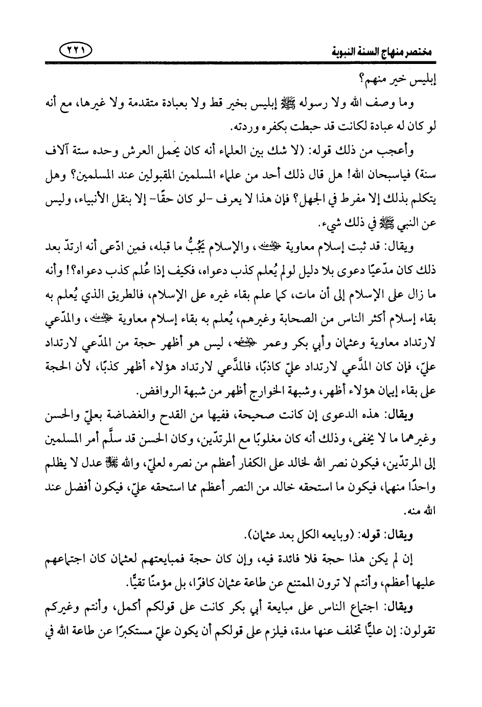 عَلَى اللَّهِ وَرَسُولِهِ وَالْمُؤْمِنِينَ، وَالْعُدْوَانِ عَلَى خَيْرِ الْقُرُونِ فِي مِثْلِ هَذَا الْمَقَامِ، وَاللَّهُ يَنْصُرُ رُسُلَهُ وَالَّذِينَ آمَنُوا فِي الْحَيَاةِ الدُّنْيَا وَيَوْمَ يَقُومُ الْأَشْهَادُ، وَالْهَوَى إِذَا بَلَغَ بِصَاحِبِهِ إِلَى هَذَا الْحَدِّ فَقَدْ أَخْرَجَ صَاحِبَهُ عَنْ رِبْقَةِ الْعَقْلِ، فَضْلًا عَنِ الْعِلْمِ وَالدِّينِ، فَنَسْأَلُ اللَّهَ الْعَافِيَةَ مِنْ كُلِّ بَلِيَّةٍ، وَإِنَّ حَقًّا عَلَى اللَّهِ أَنْ يذل أصحاب مثل هذا الْكَلَامِ، وَيَنْتَصِرَ لِعِبَادِهِ الْمُؤْمِنِينَ - مِنْ أَصْحَابِ نَبِيِّهِ وغيرهم - من هؤلاء المفترين الظالمين.