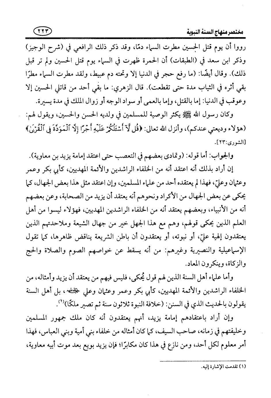 وَأَمَّا مَقْتَلُ الْحُسَيْنِ - رَضِيَ اللَّهُ عَنْهُ - فَلَا رَيْبَ أَنَّهُ قُتل مَظْلُومًا شَهِيدًا، كَمَا قُتل أَشْبَاهُهُ مِنَ الْمَظْلُومِينَ الشُّهَدَاءِ. وَقَتْلُ الْحُسَيْنِ مَعْصِيَةٌ لِلَّهِ وَرَسُولِهِ مِمَّنْ قَتَلَهُ أَوْ أَعَانَ عَلَى قَتْلِهِ أَوْ رَضِيَ بِذَلِكَ، وَهُوَ مُصِيبَةٌ أُصِيبَ بِهَا الْمُسْلِمُونَ مِنْ أَهْلِهِ وَغَيْرِ أَهْلِهِ، وَهُوَ فِي حقِّه شَهَادَةٌ لَهُ، وَرَفْعُ دَرَجَةٍ، وَعُلُوُّ مَنْزِلَةٍ؛ فَإِنَّهُ وَأَخَاهُ سَبَقَتْ لَهُمَا مِنَ اللَّهِ السَّعَادَةُ، الَّتِي لَا تُنال إِلَّا بِنَوْعٍ مِنَ الْبَلَاءِ، وَلَمْ يَكُنْ لَهُمَا مِنَ السَّوَابِقِ مَا لِأَهْلِ بَيْتِهِمَا، فَإِنَّهُمَا تَرَبَّيَا فِي حِجْرِ الْإِسْلَامِ، فِي عِزٍّ وَأَمَانٍ، فَمَاتَ هَذَا مَسْمُومًا وَهَذَا مَقْتُولًا، لِيَنَالَا بِذَلِكَ مَنَازِلَ السُّعَدَاءِ وَعَيْشَ الشُّهَدَاءِ.