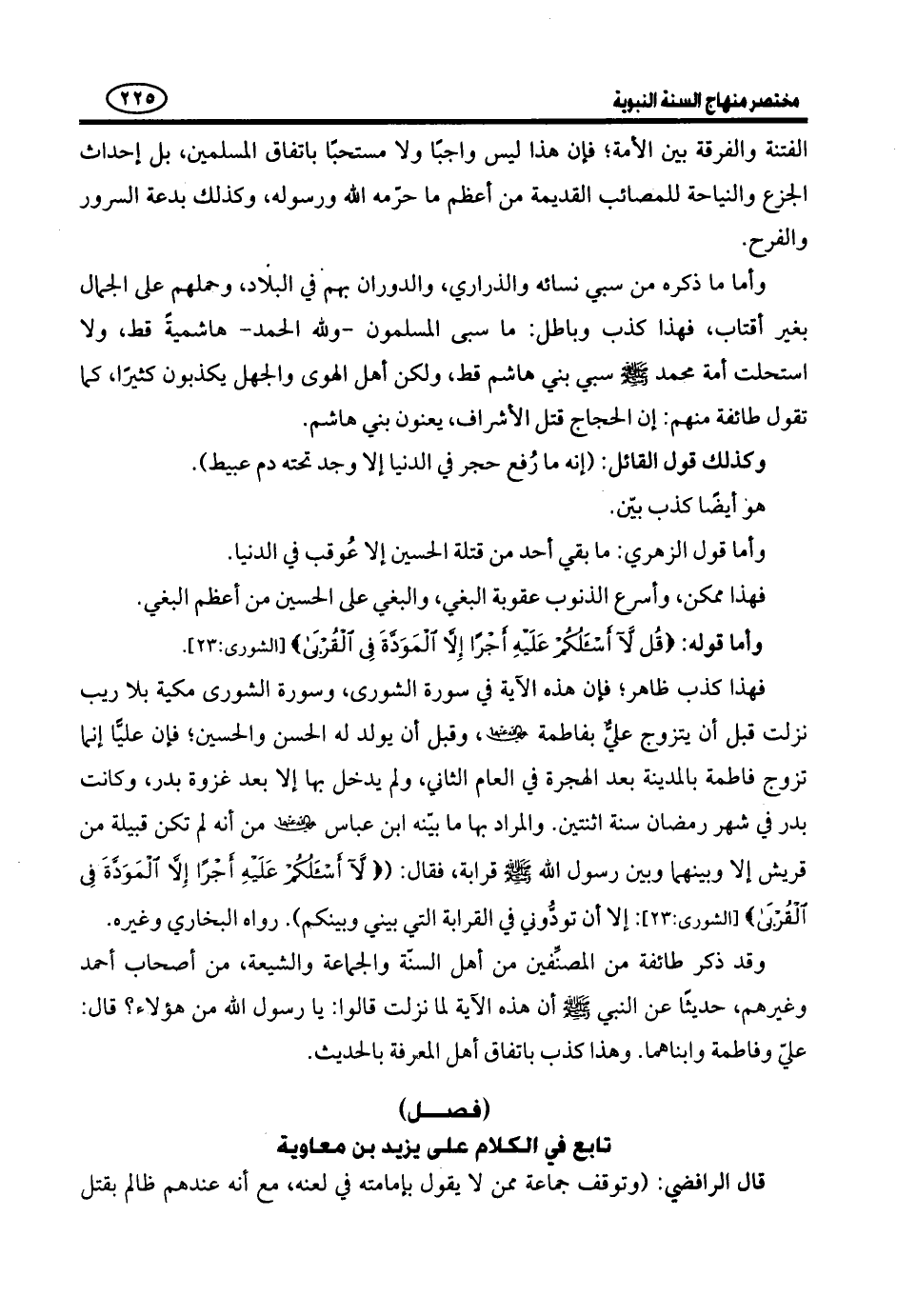 الْحُسَيْنِ وَنَهْبِ حَرِيمِهِ. وَقَدْ قَالَ اللَّهُ تَعَالَى: {أَلا لَعْنَةُ اللهِ على اَلظَّاِلمينَ} (¬1) . وقال أبو الفرج ابن الْجَوْزِيِّ مِنْ شُيُوخِ الْحَنَابِلَةِ عَنِ ابْنِ عَبَّاسٍ رَضِيَ اللَّهُ عَنْهُمَا قَالَ: أَوْحَى اللَّهُ تَعَالَى إِلَى مُحَمَّدٍ صَلَّى اللَّهُ عَلَيْهِ وَسَلَّمَ: إِنِّي قَتَلْتُ بِيَحْيَى بْنِ زَكَرِيَّا سَبْعِينَ أَلْفًا، وَإِنِّي قَاتِلٌ بِابْنِ بِنْتِكَ سَبْعِينَ أَلْفًا وَسَبْعِينَ أَلْفًا. وَحَكَى السُدِّي وَكَانَ مِنْ فُضَلَائِهِمْ قَالَ: نَزَلْتُ بِكَرْبَلَاءَ وَمَعِيَ طَعَامٌ لِلتِّجَارَةِ، فَنَزَلْنَا عَلَى رَجُلٍ فتعشينا عِنْدَهُ، وَتَذَاكَرْنَا قَتْلَ الْحُسَيْنِ وَقُلْنَا: مَا شَرَكَ أَحَدٌ فِي قَتْلِ الْحُسَيْنِ إِلَّا وَمَاتَ أَقْبَحَ مَوْتَةٍ. فَقَالَ الرَّجُلُ: مَا أَكْذَبَكُمْ، أَنَا شَرَكْتُ فِي دَمِهِ وَكُنْتُ مِمَّنْ قَتَلَهُ فَمَا أَصَابَنِي شَيْءٌ. قَالَ: فَلَمَّا كَانَ مِنْ آخِرِ اللَّيْلِ إذا أنا بصائح. قلنا مالخبر؟ قَالُوا قَامَ الرَّجُلُ يُصْلِحُ الْمِصْبَاحَ فَاحْتَرَقَتْ إِصْبَعُهُ، ثُمَّ دَبَّ الْحَرِيقُ فِي جَسَدِهِ فَاحْتَرَقَ. قَالَ السُّدِّيُّ: فَأَنَا وَاللَّهِ رَأَيْتُهُ وَهُوَ حُمَمَةٌ سَوْدَاءُ. وَقَدْ سَأَلَ مُهَنَّا بْنُ يَحْيَى أَحْمَدَ بْنَ حَنْبَلٍ عَنْ يَزِيدَ، فَقَالَ: هُوَ الَّذِي فَعَلَ مَا فَعَلَ. قُلْتُ: وَمَا فَعَلَ؟ قَالَ: نَهَبَ الْمَدِينَةَ. وَقَالَ لَهُ صَالِحٌ وَلَدُهُ يَوْمًا: إِنَّ قومنا يَنْسُبُونَنَا إِلَى تَوَلِّي يَزِيدَ. فَقَالَ: يَا بُنَيَّ وَهَلْ يَتَوَلَّى يَزِيدَ أَحَدٌ يُؤْمِنُ بِاللَّهِ وَالْيَوْمِ الْآخِرِ؟ فَقَالَ: لِمَ لَا تَلْعَنُهُ. فَقَالَ: وَكَيْفَ لَا أَلْعَنُ مَنْ لَعَنَهُ اللَّهُ فِي كِتَابِهِ؟ فَقُلْتُ: وَأَيْنَ لُعِنَ يَزِيدُ؟ فَقَالَ: فِي قَوْلِهِ تَعَالَى: {َفهلْ عَسَيْتُمْ إِنْ تَوَلَّيْتُمُ أَن تُفْسِدُوا فِي الأَرْضِ وَتُقَطِّعُوا أَرْحَامَكُمْ. أَوْلئِكَ الَّذينَ لَعَنَهُمْ اللهُ فأَصَمَّهُمْ وَأَعْمَى أَبْصَارَهُمْ} (¬2) ، فَهَلْ يَكُونُ فَسَادٌ أَعْظَمَ مِنَ الْقَتْلِ وَنَهْبِ الْمَدِينَةِ ثَلَاثَةَ أَيَّامٍ وَسَبْيِ أَهْلِهَا؟ وَقَتَلَ جَمْعًا مِنْ وُجُوهِ النَّاسِ فِيهَا مِنْ قُرَيْشٍ وَالْأَنْصَارِ وَالْمُهَاجِرِينَ مَنْ يَبْلُغُ عَدَدُهُمْ سَبْعَمِائَةٍ، وَقَتَلَ مَنْ لَمْ يُعْرَفْ مِنْ عبدٍ أَوْ حرٍ أَوِ امْرَأَةٍ عَشَرَةَ آلَافٍ، وَخَاضَ النَّاسُ فِي الدِّمَاءِ حَتَّى