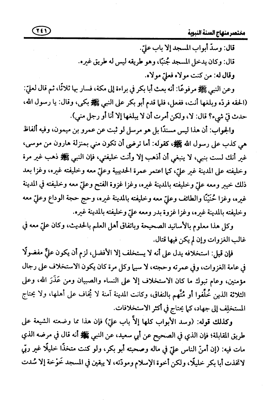 إلا خوخة أبي بكر)) (¬1) . رواه ابْنُ عَبَّاسٍ أَيْضًا فِي الصَّحِيحَيْنِ. وَمِثْلُ قَوْلِهِ: ((أَنْتَ وَلِيِّي فِي كُلِّ مُؤْمِنٍ بَعْدِي)) فَإِنَّ هذا مَوْضُوعٌ بِاتِّفَاقِ أَهْلِ الْمَعْرِفَةِ بِالْحَدِيثِ، وَالَّذِي فِيهِ مِنَ الصَّحِيحِ لَيْسَ هُوَ مِنْ خَصَائِصِ الْأَئِمَّةِ، بَلْ وَلَا مِنْ خَصَائِصِ عَلِيٍّ، بَلْ قَدْ شَارَكَهُ فِيهِ غَيْرُهُ، مِثْلَ كَوْنِهِ يُحِبُّ اللَّهَ وَرَسُولَهُ وَيُحِبُّهُ اللَّهُ وَرَسُولُهُ، وَمِثْلَ اسْتِخْلَافِهِ وَكَوْنِهِ مِنْهُ بِمَنْزِلَةِ هَارُونَ مِنْ مُوسَى، وَمِثْلَ كَوْنِ عَلِيٍّ مَوْلَى مَن النَّبِيُّ - صَلَّى اللَّهُ عَلَيْهِ وَسَلَّمَ - مَوْلَاهُ فَإِنَّ كُلَّ مُؤْمِنٍ موالٍ لِلَّهِ وَرَسُولِهِ، وَمِثْلَ كَوْنِ ((بَرَاءَةٌ)) لَا يبلِّغها إِلَّا رَجُلٌ مِنْ بَنِي هَاشِمٍ؛ فَإِنَّ هَذَا يَشْتَرِكُ فِيهِ جَمِيعُ الْهَاشِمِيِّينَ، لِمَا رُوى أَنَّ الْعَادَةَ كانت جارية بأن لا ينقض العهود ولا يحلّها إلا رجل من قبيلة المطاع.