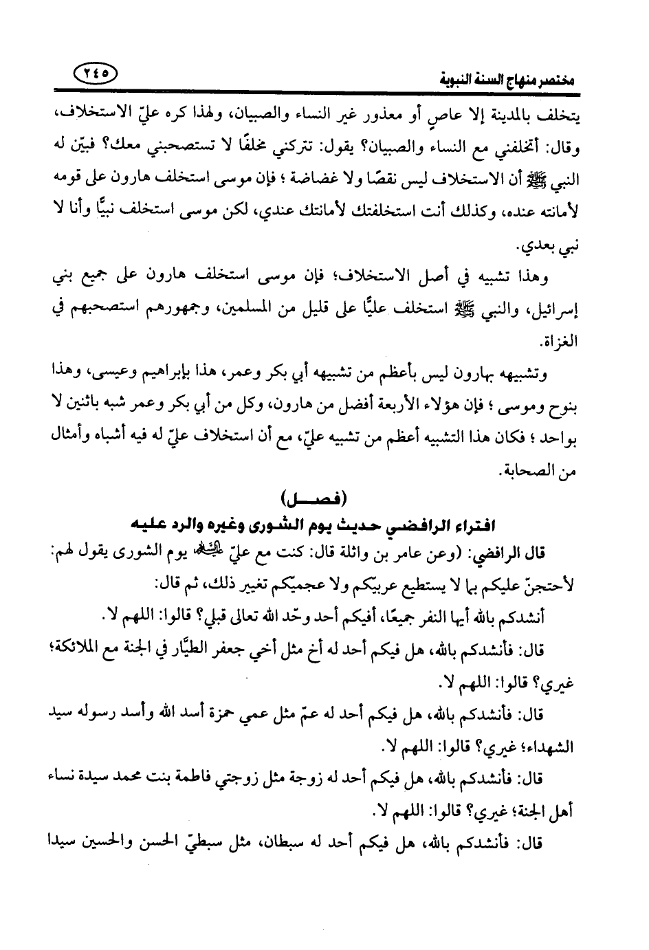 شَبَابِ أَهْلِ الْجَنَّةِ غَيْرِي؟ قَالُوا: اللَّهُمَّ لَا. قَالَ: فَأَنْشُدُكُمْ بِاللَّهِ هَلْ فِيكُمْ أَحَدٌ نَاجَى رَسُولَ اللَّهِ - صَلَّى اللَّهُ عَلَيْهِ وَسَلَّمَ - عَشْرَ مَرَّاتٍ قَدَّمَ بَيْنَ يَدَيْ نَجْوَاهُ صَدَقَةً غَيْرِي؟ قَالُوا: اللَّهُمَّ لَا. قَالَ: فَأَنْشُدُكُمْ بِاللَّهِ هَلْ فِيكُمْ أَحَدٌ قَالَ لَهُ رَسُولُ اللَّهِ - صَلَّى اللَّهُ عَلَيْهِ وَسَلَّمَ -: مَنْ كُنْتُ مَوْلَاهُ فَعَلِيٌّ مَوْلَاهُ، اللَّهُمَّ وَالِ مَنْ وَالَاهُ، وَعَادِ مَنْ عاداه، ليبلغ الشاهد الغائب غَيْرِي؟ قَالُوا: اللَّهُمَّ لَا. قَالَ: فَأَنْشُدُكُمْ بِاللَّهِ هَلْ فِيكُمْ أَحَدٌ قَالَ لَهُ رَسُولُ اللَّهِ - صَلَّى اللَّهُ عَلَيْهِ وَسَلَّمَ -: اللَّهُمَّ ائْتِنِي بِأَحَبِّ خَلْقِكَ إِلَيْكَ وَإِلَيَّ يَأْكُلُ مَعِي مِنْ هَذَا الطَّيْرِ، فَأَتَاهُ فَأَكَلَ مَعَهُ غَيْرِي؟ قَالُوا: اللَّهُمَّ لَا. قَالَ: فَأَنْشُدُكُمْ بِاللَّهِ هَلْ فِيكُمْ أَحَدٌ قَالَ لَهُ رَسُولُ اللَّهِ - صَلَّى اللَّهُ عَلَيْهِ وَسَلَّمَ -: لَأُعْطِيَنَّ الرَّايَةَ رَجُلًا يُحِبُّ اللَّهَ وَرَسُولَهُ وَيُحِبُّهُ اللَّهُ وَرَسُولُهُ، لَا يَرْجِعُ حَتَّى يَفْتَحَ اللَّهُ عَلَى يَدَيْهِ إِذْ رَجَعَ غَيْرِي مُنْهَزِمًا غَيْرِي؟ قَالُوا: اللَّهُمَّ لَا. قَالَ: فَأَنْشُدُكُمْ بِاللَّهِ هَلْ فِيكُمْ أَحَدٌ قَالَ لَهُ رَسُولُ اللَّهِ - صَلَّى اللَّهُ عَلَيْهِ وَسَلَّمَ - لِبَنِي وَكِيعَةَ: لَتَنْتَهُنَّ أَوْ لَأَبْعَثَنَّ إِلَيْكُمْ رَجُلًا نَفْسُهُ كَنَفْسِي وَطَاعَتُهُ كَطَاعَتِي، وَمَعْصِيَتُهُ كَمَعْصِيَتِي يَفْصِلُكُمْ بِالسَّيْفِ غَيْرِي؟ قَالُوا: اللَّهُمَّ لَا. قَالَ: فَأَنْشُدُكُمْ بِاللَّهِ هَلْ فِيكُمْ أَحَدٌ قَالَ لَهُ رَسُولُ اللَّهِ - صَلَّى اللَّهُ عَلَيْهِ وَسَلَّمَ - كَذَبَ مَنْ زَعَمَ أَنَّهُ يُحِبُّنِي وَيُبْغِضُ هَذَا غَيْرِي؟ قَالُوا: اللَّهُمَّ لَا. قَالَ: فَأَنْشُدُكُمْ بِاللَّهِ هَلْ فِيكُمْ أَحَدٌ سلَّم عَلَيْهِ فِي سَاعَةٍ وَاحِدَةٍ ثَلَاثَةُ آلَافٍ مِنَ الْمَلَائِكَةِ: جِبْرَائِيلُ وَمِيكَائِيلُ وَإِسْرَافِيلُ حَيْثُ جِئْتُ بِالْمَاءِ إِلَى رَسُولِ اللَّهِ - صَلَّى اللَّهُ عَلَيْهِ وَسَلَّمَ - من الْقَلِيبِ غَيْرِي؟ قَالُوا: اللَّهُمَّ لَا. قَالَ: فَأَنْشُدُكُمْ بِاللَّهِ هَلْ فِيكُمْ أَحَدٌ نُودِيَ بِهِ مِنَ السَّمَاءِ: لَا سَيْفَ إِلَّا ذُو الْفَقَارِ، وَلَا فَتًى إِلَّا عَلِيٌّ غَيْرِي؟ قَالُوا: اللَّهُمَّ لَا. قال: قَالَ: فَأَنْشُدُكُمْ بِاللَّهِ هَلْ فِيكُمْ أَحَدٌ قَالَ لَهُ جِبْرِيلُ هَذِهِ هِيَ الْمُوَاسَاةُ، فَقَالَ لَهُ رَسُولُ اللَّهِ - صَلَّى اللَّهُ عَلَيْهِ وَسَلَّمَ -: أنه مِنِّي وَأَنَا مِنْهُ. فَقَالَ جِبْرِيلُ: وَأَنَا مِنْكُمَا غَيْرِي؟ قَالُوا: اللَّهُمَّ لَا. قَالَ فَأَنْشُدُكُمْ بِاللَّهِ هَلْ فِيكُمْ أَحَدٌ قَالَ لَهُ رَسُولُ اللَّهِ صَلَّى اللَّهُ عَلَيْهِ وَسَلَّمَ: تُقَاتِلُ النَّاكِثِينَ وَالْقَاسِطِينَ