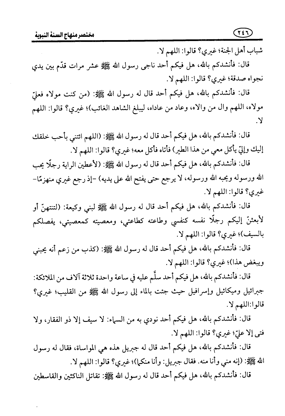 بِاللَّهِ هَلْ فِيكُمْ أَحَدٌ رُدّت عَلَيْهِ الشَّمْسُ حَتَّى صَلَّى الْعَصْرَ فِي وَقْتِهَا غَيْرِي؟ قَالُوا: اللَّهُمَّ لَا. قال فأنشدكم بالله هل فِيكُمْ أَحَدٌ أَمَرَهُ رَسُولُ اللَّهِ - صَلَّى اللَّهُ عَلَيْهِ وَسَلَّمَ - أَنْ يَأْخُذَ ((بَرَاءَةٌ)) مِنْ أَبِي بَكْرٍ، فَقَالَ لَهُ أَبُو بَكْرٍ: يَا رَسُولَ اللَّهِ أَنَزَلَ فِيَّ شَيْءٌ؟ فَقَالَ لَهُ رَسُولُ اللَّهِ - صَلَّى اللَّهُ عَلَيْهِ وَسَلَّمَ -: إِنَّهُ لَا يُؤَدِّي عَنِّي إِلَّا عَلِيٌّ غَيْرِي؟ قَالُوا: اللَّهُمَّ لَا.