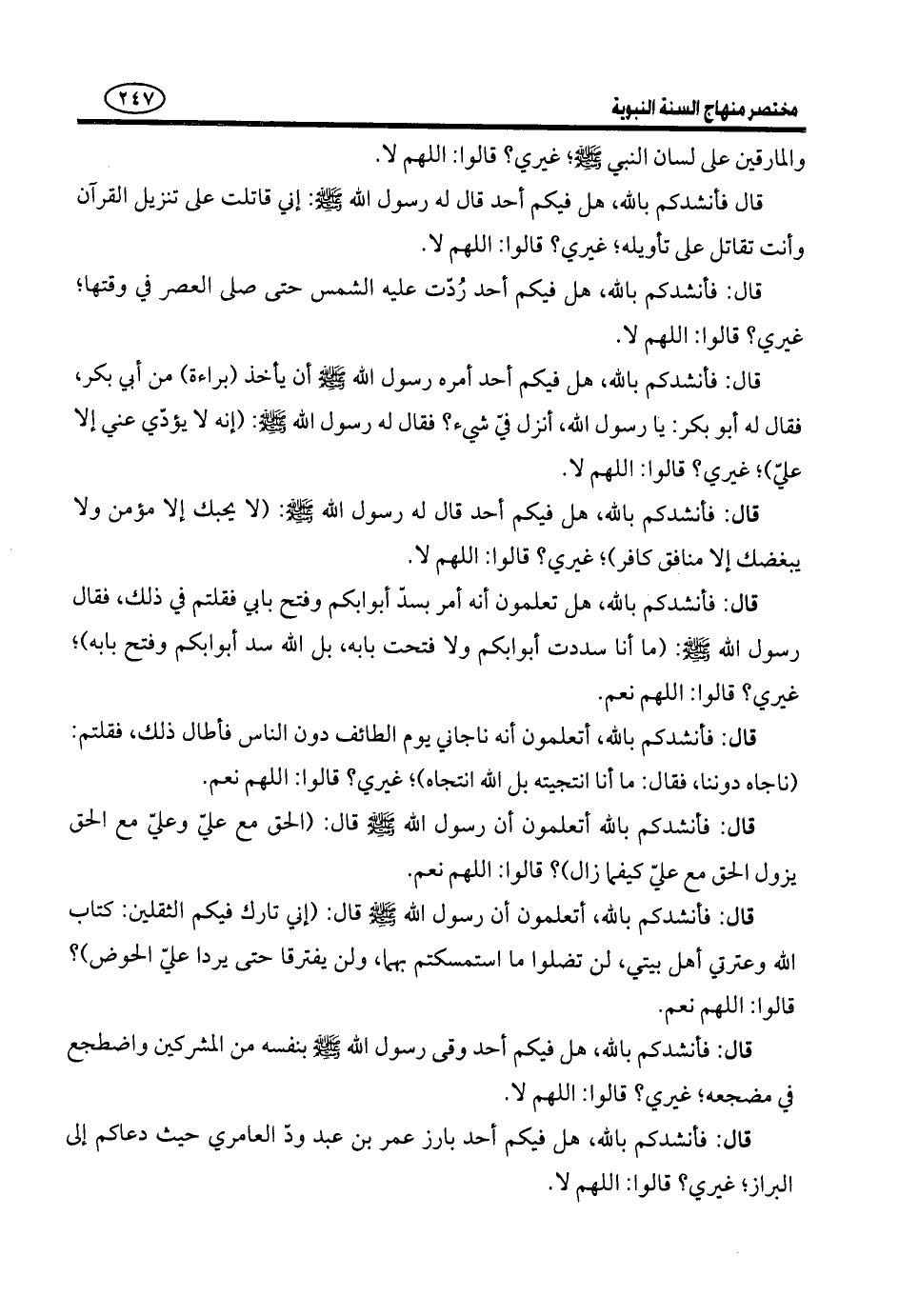 قَالَ: فَأَنْشُدُكُمْ بِاللَّهِ هَلْ فِيكُمْ أَحَدٌ قَالَ لَهُ رَسُولُ اللَّهِ صَلَّى اللَّهُ عَلَيْهِ وَسَلَّمَ: أَنْتَ سَيِّدُ الْمُؤْمِنِينَ غَيْرِي؟ قَالُوا: اللَّهُمَّ لَا.