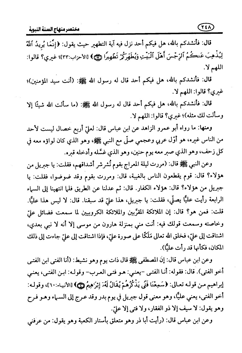 وفي هذا الحديث الذي ذكره الرَّافِضِيُّ أَنْوَاعٌ مِنَ الْأَكَاذِيبِ الَّتِي نَزَّهَ اللَّهُ عَلِيًّا عَنْهَا، مِثْلَ احْتِجَاجِهِ بِأَخِيهِ وَعَمِّهِ وَزَوْجَتِهِ، وَعَلِيٌّ - رَضِيَ اللَّهُ عَنْهُ - أَفْضَلُ مِنْ هَؤُلَاءِ، وَهُوَ يَعْلَمُ أَنَّ أَكْرَمَ الْخَلْقِ عِنْدَ اللَّهِ أَتْقَاهُمْ. وَلَوْ قَالَ الْعَبَّاسُ: هَلْ فِيكُمْ مِثْلُ أَخِي حَمْزَةَ وَمِثْلُ أَوْلَادِ إِخْوَتِي مُحَمَّدٍ وَعَلِيٍّ وَجَعْفَرٍ؟! لَكَانَتْ هَذِهِ الْحُجَّةُ مِنْ جِنْسِ تِلْكَ، بَلِ احْتِجَاجُ الْإِنْسَانِ بِبَنِي إِخْوَتِهِ أَعْظَمُ مِنِ احْتِجَاجِهِ بِعَمِّهِ. وَلَوْ قَالَ عُثْمَانُ: هَلْ فِيكُمْ مَنْ تَزَوَّجَ بنتَى نَبِيٍّ لَكَانَ مَنْ جِنْسِ قَوْلِ الْقَائِلِ: هَلْ فِيكُمْ مَنْ زَوْجَتُهُ كَزَوْجَتِي؟ وَكَانَتْ فَاطِمَةُ قَدْ مَاتَتْ قَبْلَ الشُّورَى كَمَا ماتت زوجتا عثمان، فإنها ماتت بَعْدَ مَوْتِ النَّبِيِّ - صَلَّى اللَّهُ عَلَيْهِ وَسَلَّمَ -