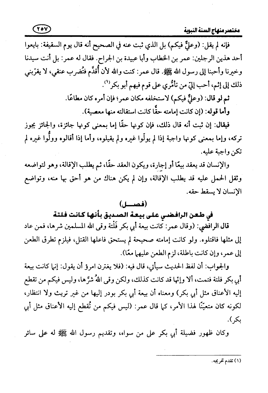 ثُمَّ يُقَالُ: هَذَا يَقْدَحُ فِيمَا تَدَّعُونَهُ مِنَ النَّصِّ عَلَى عَلِيٍّ؛ فَإِنَّهُ لو كان قد نَصَّ عَلَى عَلِيٍّ لَمْ يَكُنْ لِلْأَنْصَارِ فِيهِ حَقٌّ، وَلَمْ يَكُنْ فِي ذَلِكَ شَكٌّ.