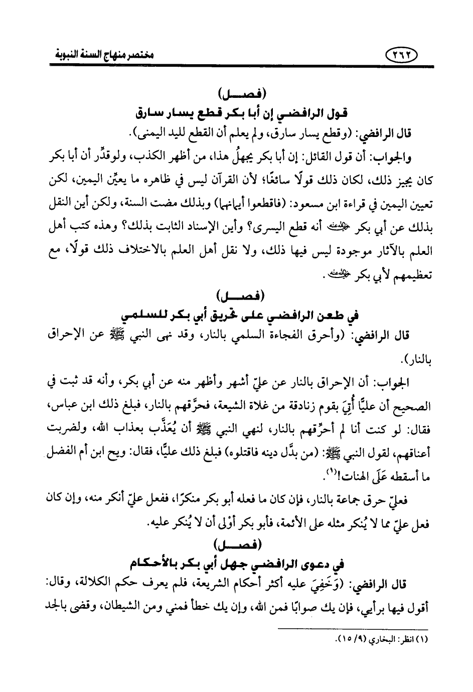 وَالْجَوَابُ: أَنَّ هَذَا مِنْ أَعْظَمِ الْبُهْتَانِ. كَيْفَ يَخْفَى عَلَيْهِ أَكْثَرُ أَحْكَامِ الشَّرِيعَةِ، وَلَمْ يَكُنْ بِحَضْرَةِ النَّبِيِّ - صَلَّى اللَّهُ عَلَيْهِ وَسَلَّمَ - مَنْ يَقْضِي ويُفتى إِلَّا هُوَ؟! وَلَمْ يَكُنِ النَّبِيُّ - صَلَّى اللَّهُ عَلَيْهِ وَسَلَّمَ - أَكْثَرَ مُشَاوَرَةً لأحدٍ من الصحابة مِنْهُ لَهُ وَلِعُمَرَ. وَلَمْ يَكُنْ أحدٌ أَعْظَمَ اخْتِصَاصًا بِالنَّبِيِّ - صَلَّى اللَّهُ عَلَيْهِ وَسَلَّمَ - مِنْهُ ثم عمر.