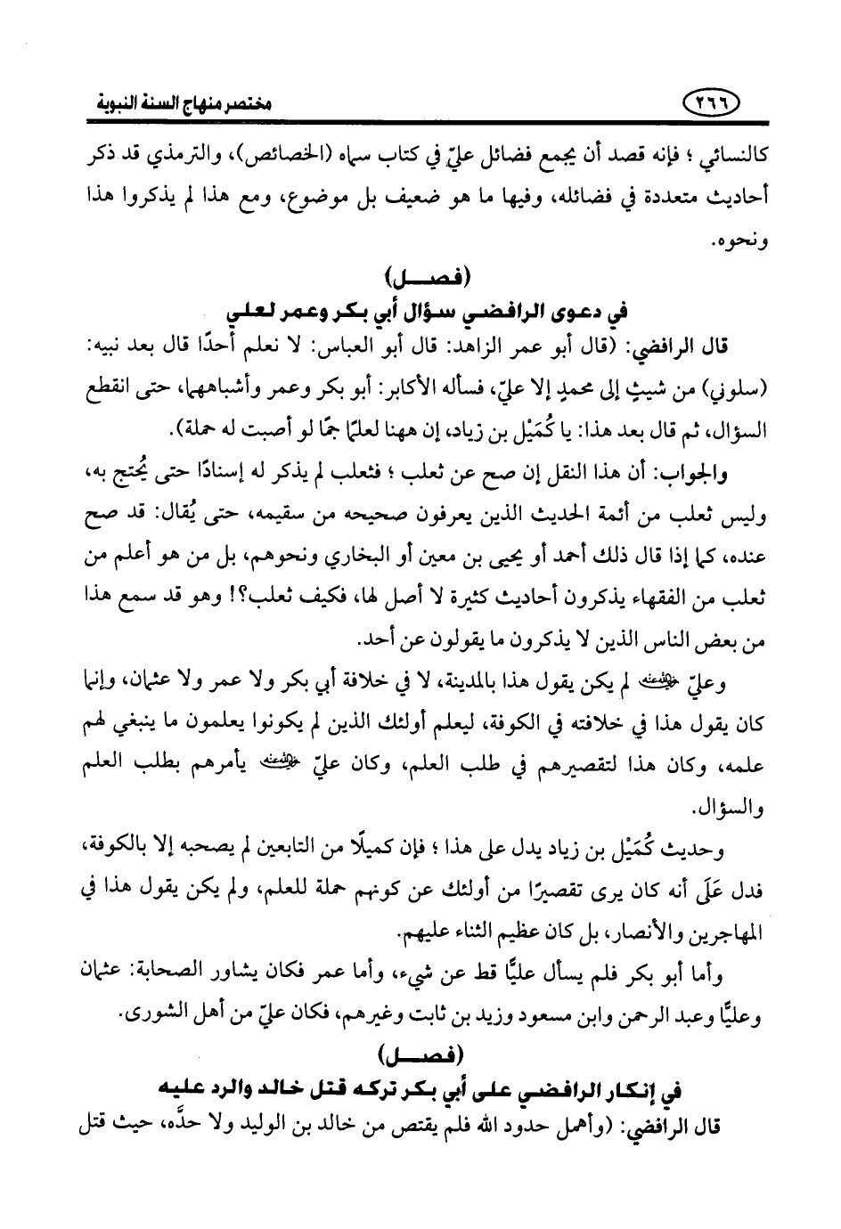 وَالْجَوَابُ أَنْ يُقَالَ أَوَّلًا: إِنْ كَانَ تَرْكُ قَتْلِ قَاتِلِ الْمَعْصُومِ مِمَّا يُنكر عَلَى الْأَئِمَّةِ، كَانَ هَذَا مِنْ أَعْظَمِ حُجَّةِ شِيعَةِ عُثْمَانَ عَلَى عَلِيٍّ؛ فَإِنَّ عُثْمَانَ خَيْرٌ مِنْ مَلْءِ الْأَرْضِ مِنْ مِثْلِ مَالِكِ بْنِ نُوَيْرَةَ، وَهُوَ خَلِيفَةُ الْمُسْلِمِينَ، وَقَدْ قُتل مَظْلُومًا شَهِيدًا بِلَا تَأْوِيلٍ مسوِّغ لِقَتْلِهِ. وَعَلِيٌّ لَمْ يَقْتُلْ قَتَلَته، وَكَانَ هَذَا مِنْ أَعْظَمِ مَا امْتَنَعَتْ بِهِ شِيعَةُ عُثْمَانَ عَنْ مُبَايَعَةِ عليّ، فإنْ كَانَ عَلِيٌّ لَهُ عُذْرٌ شَرْعِيٌّ فِي تَرْكِ قَتْلِ قَتَلَةِ عُثْمَانَ، فَعُذْرُ أَبِي بَكْرٍ فِي تَرْكِ قَتْلِ قَاتِلِ مَالِكِ بْنِ نُوَيْرَةَ أَقْوَى، وَإِنْ لَمْ يَكُنْ لِأَبِي بَكْرٍ عُذْرٌ فِي ذَلِكَ فَعَلِيٌّ أَوْلى أَنْ لَا يَكُونَ لَهُ عُذْرٌ فِي تَرْكِ قَتْلِ قَتَلَةِ عُثْمَانَ.