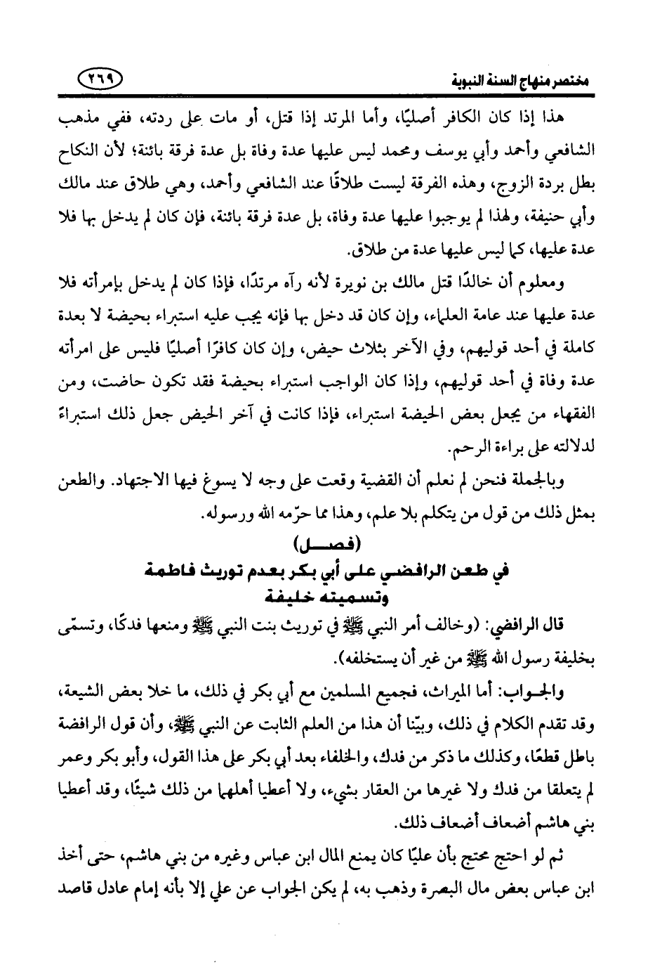 وَهَذَا الْجَوَابُ هُوَ فِي حَقِّ أَبِي بَكْرٍ بطريق الأولى والأحرى. وأبو بكر أعظم محبة لفاطمة ومرعاة لَهَا مِنْ عَلِيٍّ لِابْنِ عَبَّاسٍ. وَابْنُ عَبَّاسٍ بِعَلِيٍّ أَشْبَهُ مِنْ فَاطِمَةَ بِأَبِي بَكْرٍ , فَإِنَّ فَضْلَ أَبِي بَكْرٍ عَلَى فَاطِمَةَ أَعْظَمُ مِنْ فضل عليّ على ابن عباس.