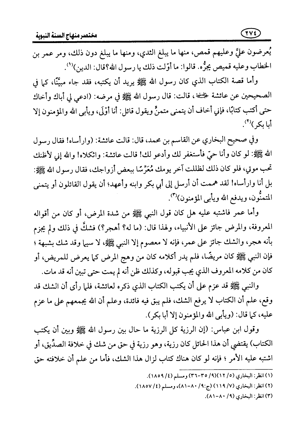 وَأَيْضًا فَلَمْ يَكُنْ يَجُوزُ عِنْدَهُمْ تَأْخِيرُ الْبَيَانِ إِلَى مَرَضِ مَوْتِهِ، وَلَا يَجُوزُ لَهُ تَرْكُ الْكِتَابِ لِشَكِّ مَنْ شَكَّ، فَلَوْ كَانَ مَا يَكْتُبُهُ فِي الْكِتَابِ مِمَّا يَجِبُ بَيَانُهُ وَكِتَابَتُهُ، لَكَانَ النَّبِيُّ - صَلَّى اللَّهُ عَلَيْهِ وَسَلَّمَ - يُبَيِّنُهُ وَيَكْتُبُهُ، وَلَا يَلْتَفِتُ إِلَى قَوْلِ أحدٍ، فَإِنَّهُ أَطْوَعُ الْخَلْقِ لَهُ، فعُلم أَنَّهُ لَمَّا تَرَكَ الْكِتَابَ لَمْ يَكُنِ الْكِتَابُ وَاجِبًا، وَلَا كَانَ فِيهِ مِنَ الدِّينِ مَا تَجِبُ كِتَابَتُهُ حِينَئِذٍ، إِذْ لَوْ وَجَبَ لَفَعَلَهُ، وَلَوْ أَنَّ عُمَرَ - رَضِيَ اللَّهُ عَنْهُ - اشْتَبَهَ عَلَيْهِ أمر، ثم تبيّن له أوشك فِي بَعْضِ الْأُمُورِ، فَلَيْسَ هُوَ أَعْظَمَ مِمَّنْ يُفْتِي وَيَقْضِي بِأُمُورٍ وَيَكُونُ النَّبِيُّ - صَلَّى اللَّهُ عَلَيْهِ وَسَلَّمَ - قَدْ حَكَمَ بِخِلَافِهَا، مُجْتَهِدًا فِي ذَلِكَ، وَلَا يَكُونُ قَدْ عَلِمَ حُكْمَ النَّبِيِّ صل اللَّهُ عَلَيْهِ وَسَلَّمَ؛ فَإِنَّ الشَّكَّ فِي الْحَقِّ أَخَفُّ مِنَ الْجَزْمِ بِنَقِيضِهِ.