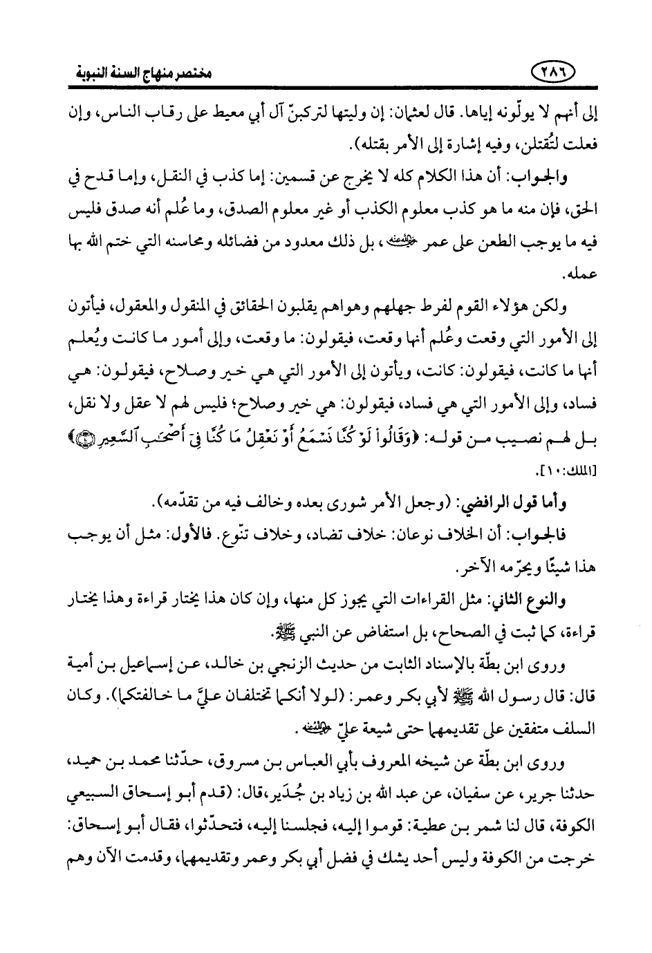 وَكَيْفَ لَا تُقَدِّمُ الشِّيعَةُ الْأُولَى أَبَا بَكْرٍ وَعُمَرَ، وَقَدْ تَوَاتَرَ عَنْ أَمِيرِ الْمُؤْمِنِينَ عَلِيِّ بْنِ أَبِي طَالِبٍ رَضِيَ اللَّهُ عَنْهُ أَنَّهُ قَالَ: ((خَيْرُ هَذِهِ الْأُمَّةِ بَعْدَ نَبِيِّهَا أَبُو بَكْرٍ ثُمَّ عُمَرُ)) (¬1) وَقَدْ رُوِيَ هَذَا عَنْهُ مِنْ طُرُقٍ كَثِيرَةٍ، قِيلَ: إِنَّهَا تَبْلُغُ ثَمَانِينَ طَرِيقًا.